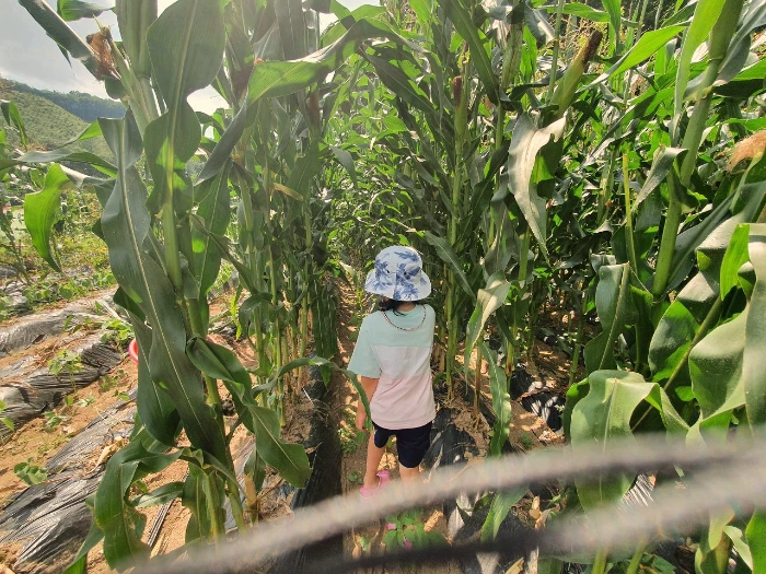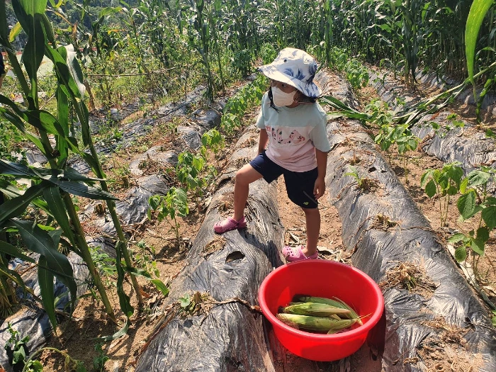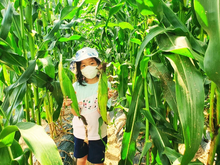 처음 보는 옥수수 숲에서 옥수수를 따 보는 아이...