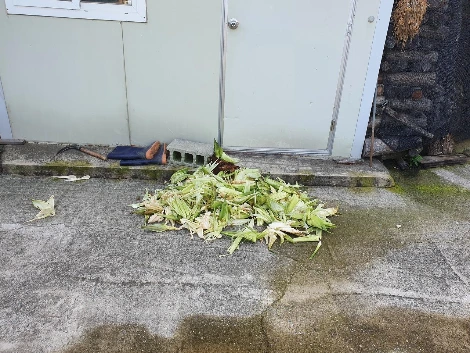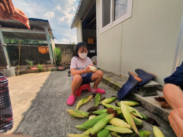 삶은 옥수수는 삶아서 먹고, 남은 찌꺼기는 닭에게 먹이로 주고,