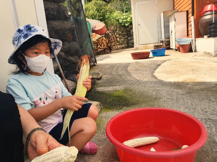 아이들은 옥수수를 다듬는 할머니 옆에서 옥수수를 다듬었다.