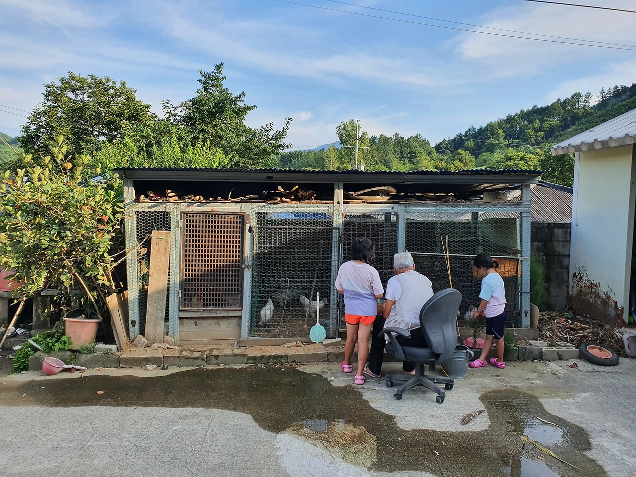 진외증조 할아버지와 닭장 앞에서닭장에 닭들을 보며 신기하는 아이들이었다.