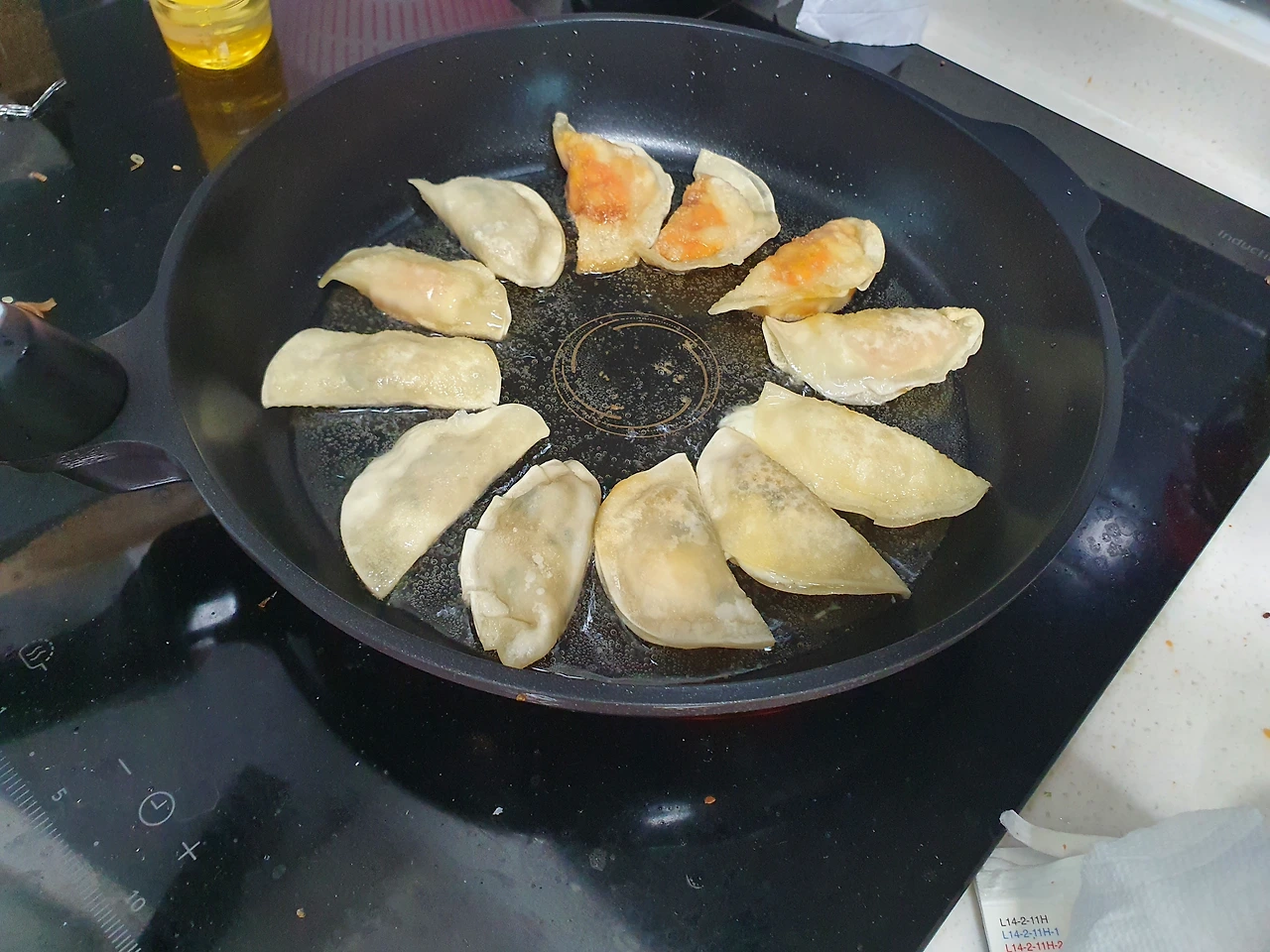 아이들이 만든 만두를 신랑이 기름에 살짝 굽는다.