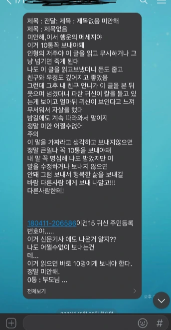 "그 문자를 안 보내면 밤에 귀신이 찾아온다고 했대요."