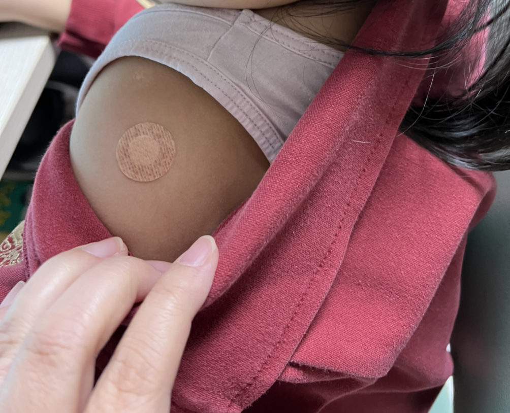 아이가 맞은 팔에 집중하는 사이, 주사액이 들어있는 바늘이 둘째에 어깨에 쏙 들어갔다가 나왔다.