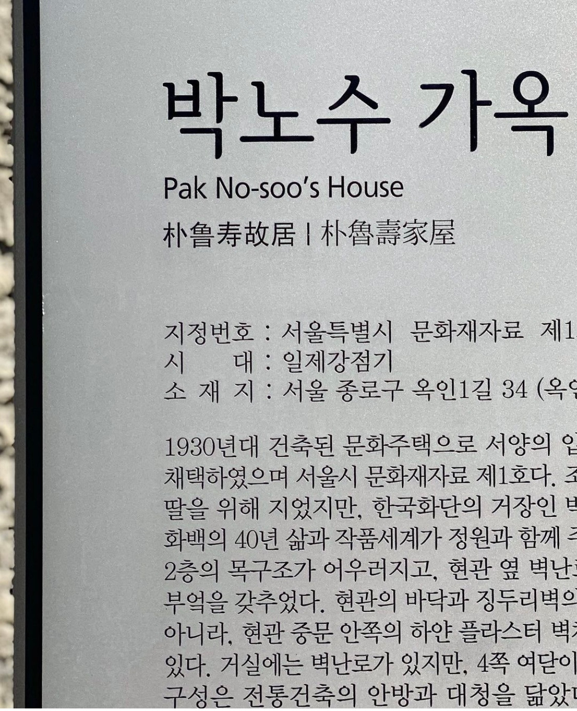 한국미술 책을 보다 이 그림 한 장에 꽂혀 전부터 박노수 미술관을 꼭 가보고 싶었다 간결하면서도 과감하고 짙은 단색으로 흑백 대조 처리한 이 그림이 그렇게 세련돼 보일 수가 없는 것이다 박노수 가옥 안을 사진으로 담을 순 없었지만 역시나 나는 자연을 사랑하는 화가들이 좋은가 보다 여러 작품들 중에서도 산이나 강을 그린 그림들이 유독 눈에 들어오더라 자연합일 자연 관조 무위자연을 감각적으로 채색한 화가 박노수 님 가옥을 열심히 감상 후 밖으로 나왔다 마당 뒤쪽에 가파른 경사가 있는 돌담길로 향하였다 외관은 사진을 찍어도 된다 했다