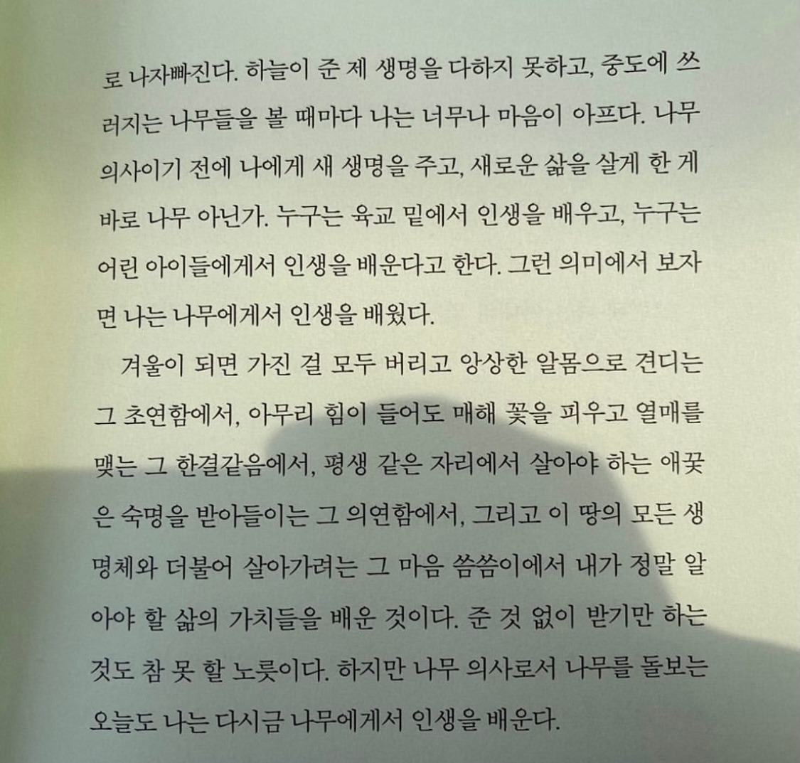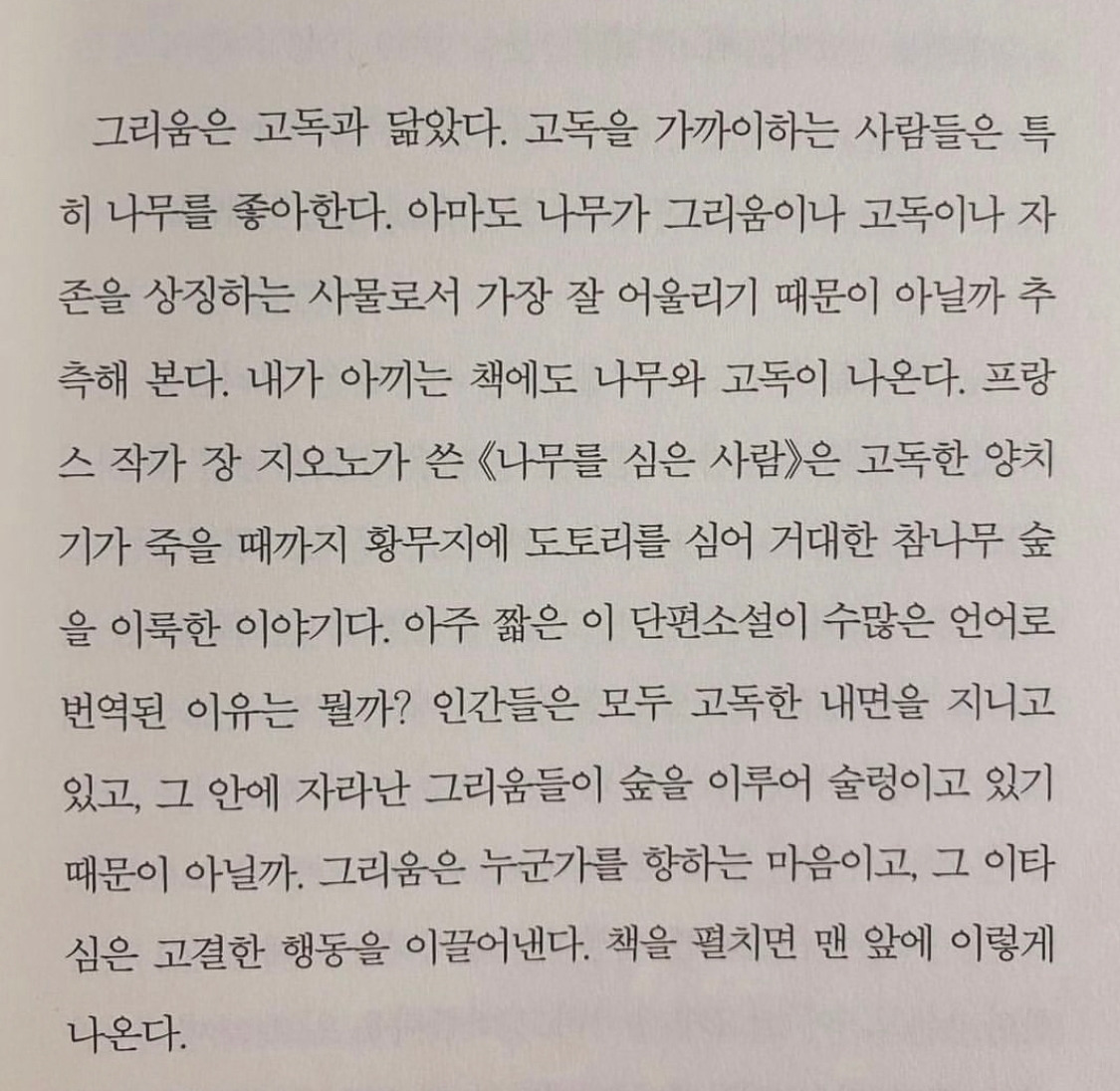 전에 읽었던 ‘나는 나무에게 인생을 배웠다’라는 책에서 인상 깊은 챕터의 제목이 아직도 기억에 남는데 나무는 빛이 디자인하고 바람이 다듬는다 빛과 바람 너무나 멋진 말이라 마음속에 각인되어 잊히지가 않는다 나무를 보다 보면 세상 가장 깊은 내면의 고독을 떠안고 나에게 위로를 건네주기도 하고 탐스러운 잎사귀들과 꽃들이 마중 나와 나를 반겨주기도 하니깐 계절을 따라 차곡차곡 춘재와 추재가 겹쳐지면서 나이테라고 하는 나뭇결이 생겨난다 아름다운 결일수록 나무의 수많은 방황의 흔적들이 쌓인 걸 테고 나뭇가지들이 일관된 방향 없이 얽히고설키는 그런 나무의 삶이 사람의 삶과 무릇 다르지 않구나 느껴진다 나무는 다른 나무의 처지를 비교하지 않고 온전히 자기답게 사는 것에 집중한다 그래서 나무를 사랑하는 사람 중에 나쁜 사람은 없다는 나의 생각은 여전히 확고하다