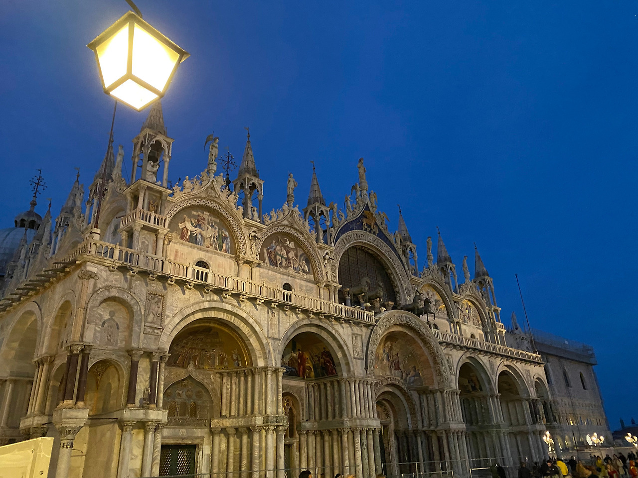 산마르코 광장은 베네치아의 정치, 종교, 문화의 중심지이자 두칼레 궁전과 산마르코 대성당이 자리 잡고 있는 이탈리아에서 가장 유명한 광장 중 한 곳이다. 광장의 4면을 건물들이 모두 둘러싸고 있는 구조가 아니라 3면을 싸고 있고, 뚫려 있는 한쪽 면은 바다를 향하고 있는 것이 특징으로, 나폴레옹이 '유럽에서 가장 아름다운 응접실'이라고 찬사 했을 정도로 웅장하면서도 아름다운 광장이다. 우리가 찾아갔을 땐 이미 해가 거의 진 시간이었기에 자연스레 광장의 야경이 시작되는 것을 볼 수 있었다.