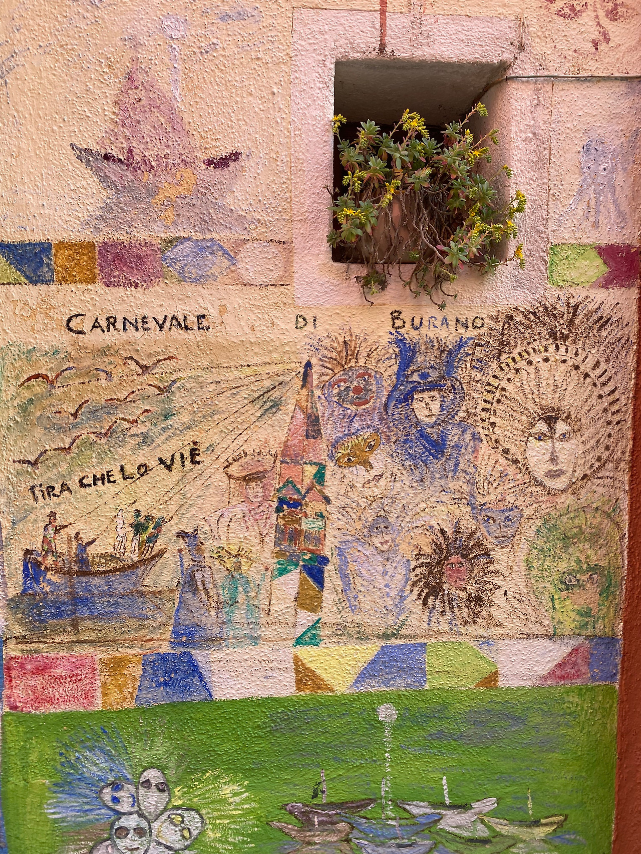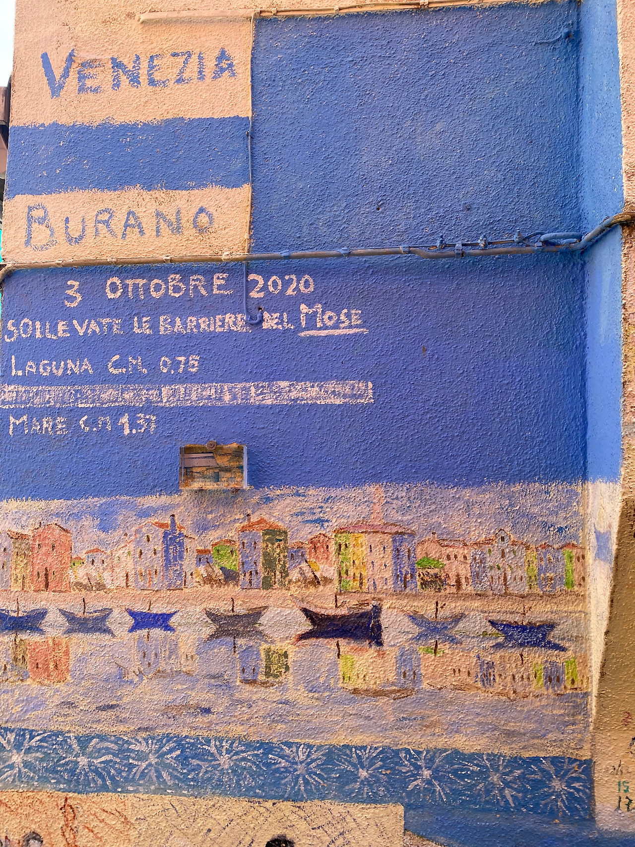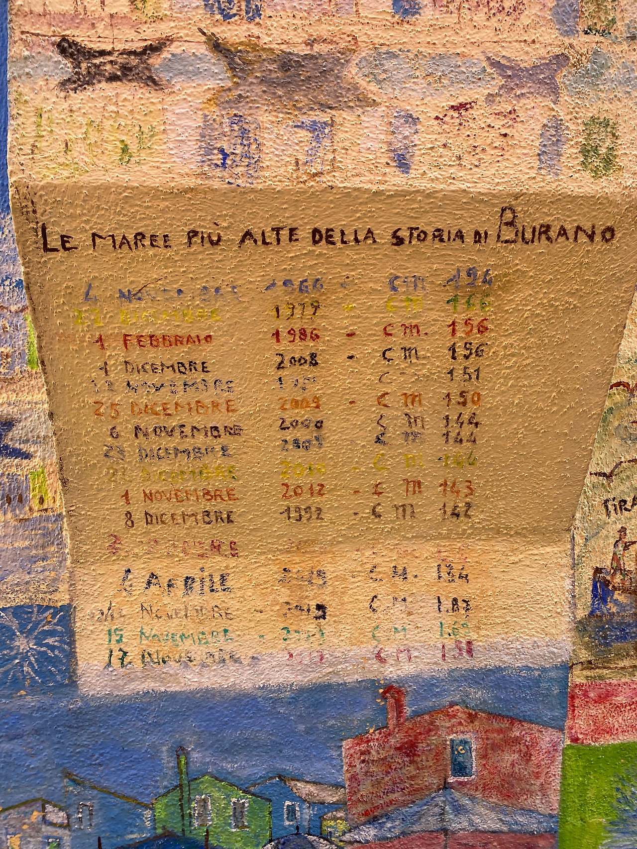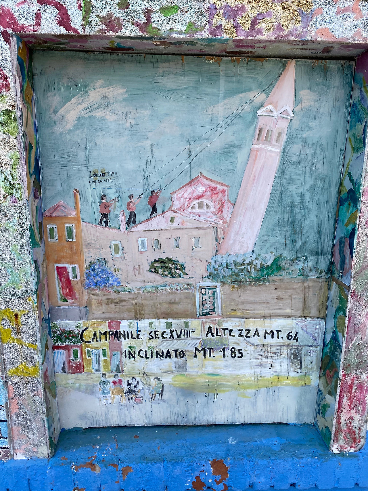 이 섬에는 작은 피사의 사탑이라 불리는 산 마르티노 성당의 기울어진 종탑이 있다. 부라노의 중심이라 할 수 있는 성당 앞 갈루피 광장에는 레스토랑과 각종 상점들이 문을 열고 있었는데, 작은 골목 사이 그려져 있는 몇 개의 벽화들이 눈에 들어왔다. 가만히 다가가서 자세히 살펴보니 각 벽화마다 부라노섬에 대한 스토리들이 담겨 있었다.(나중에 찾아보니 이 벽화가 그려진 건물이 Casa di Gianfranco Rosso라고 구글맵에 표시가 되어 있었다.) 한 벽화에는 'Le Maree Piu Alte Della Storia Di BURANO'-'부라노의 역사상 가장 높은 조수'의 높이, 즉 홍수의 역사를 기록해 놓았고, 또 다른 벽화엔 산마르코 성당 종탑의 높이와 기울기의 수치와 함께 종탑을 묘사해 놓았다. 이 외에도 부라노섬의 풍경을 인상파적인 화풍으로 그려놓기도 하고, 2020년 10월 3일 베네치아의 해수면 상승으로 인한 바닷물의 습격을 막기 위해 진행한 모세의 장벽 프로젝트의 성공을 기념하는 그림도 있었다.
