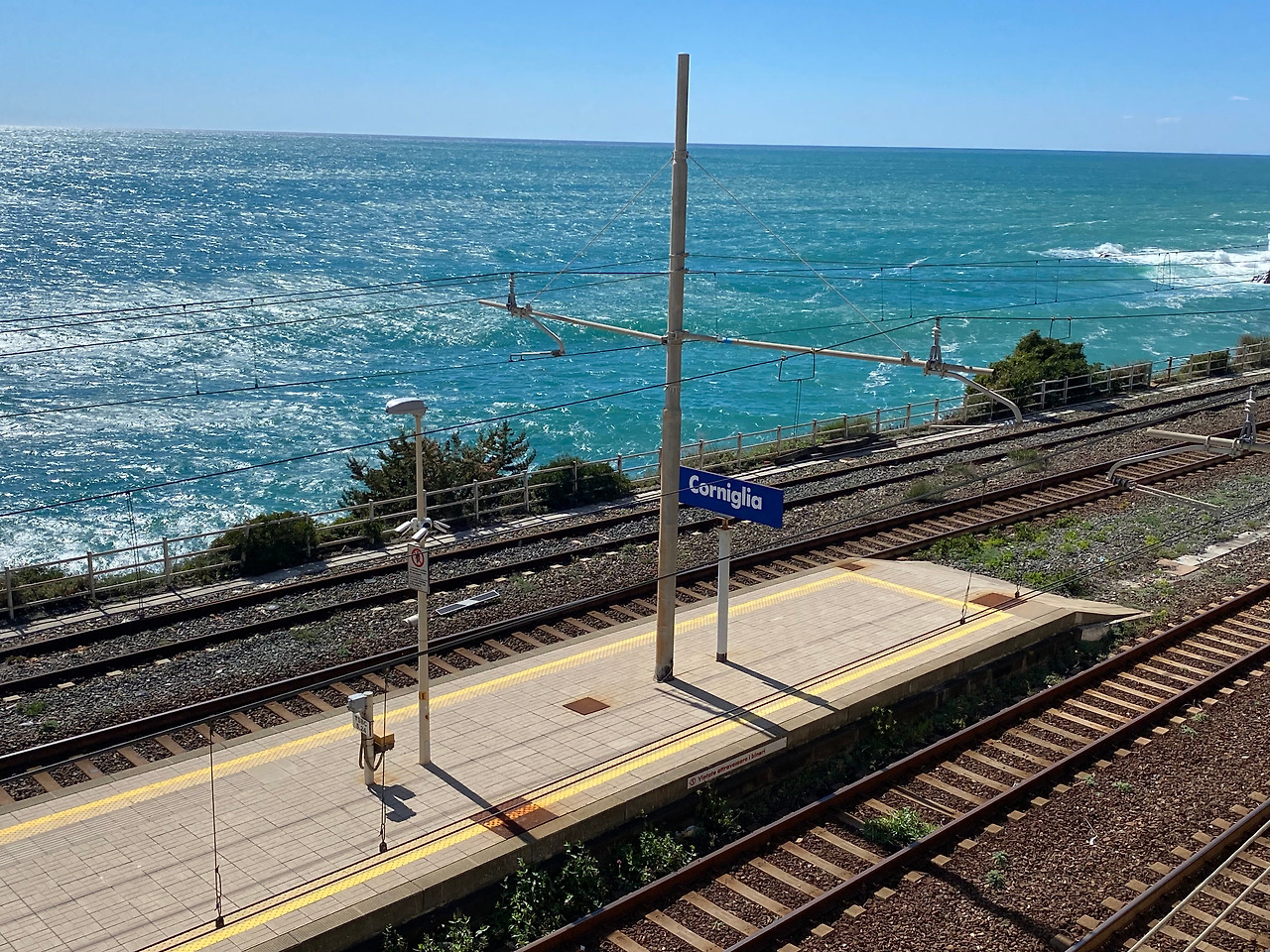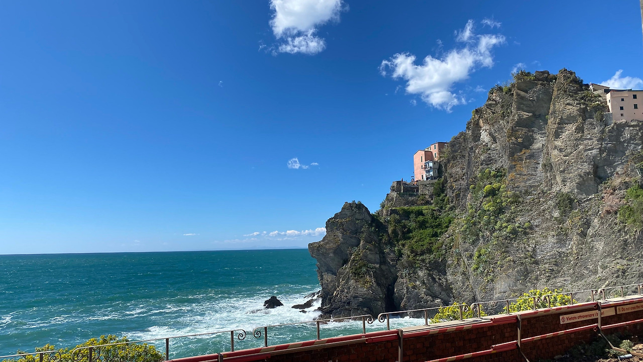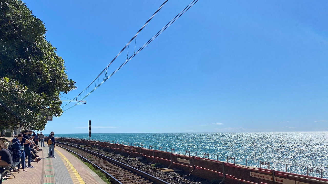 숙소에 체크인하고 짐을 풀어놓은 후, 근처 레스토랑에서 파스타와 샐러드로 점심을 해결하고 다시 마나롤라역으로 향했다. 친퀘테레가 유명한 건 마을의 풍경도 있지만 마을들을 연결하는 길과 그 길에 펼쳐진 풍경 때문이기도 하다. 그리고, 이 길들이 대부분 우리의 제주 올래 혹은 지리산 둘레길 같은 트래킹 코스로 소개되어 있다. 우리도 여러 코스들 중 한 코스를 걸어보기로 했다. 우리가 선택한 코스는 코르닐리아(Corniglia)에서 베르나차(Vernazza)까지 3.5km 거리의 코스였기에 마나롤라에서 코르닐리아까지 기차를 타고 이동했다. 사실, 라 스페치아에서 마나롤라로 이동하는 기차 속에서 이미 기가 막힌 바다 풍경에 감탄한 바 있었는데, 바다옆에 바로 붙어 있는 마나롤라역의 풍경은 환상적이라는 표현도 모자란 정도란 생각이 들 만큼 아름다웠다. 작은 시골 기차역이지만 철로를 조금만 벗어나면 바다와 맞붙어 있는 절벽이기에 끝도 없이 이어지는 푸른 바다와 하늘이 함께 만들어내는 장관을 어디서 또 만날 수 있을까 하던 와중에 절벽에 매달려 있듯이 지어져 있는 건물들에게도 시선을 빼앗겨 버렸던,,, 한 마디로 시선 강탈의 연속이었다.