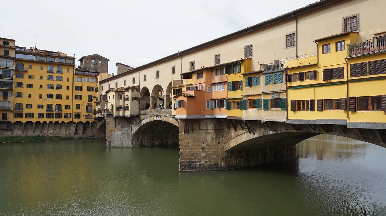 Museo degli Innocenti에서의 감동과 존경심을 뒤로하고 피렌체의 명소이자 상징인 베키오 다리로 향했다. 이미 너무나도 유명한 이 다리는 피렌체를 가로지르는 아르노 강 위에 놓인 중세에 만들어진 다리로 다리 위에 만들어져 있는 가게들로 유명하다. 또한 강가에서 바라본 이 다리의 알록달록하고 아기자기한 전경 때문에 유명하기도 한데, 지금은 보석상이나 미술품, 기념품 판매소 위주의 가게들은 본래 푸줏간들이었다는 역사를 갖고 있기도 하다. 1345년에 재건되어 아르노 강에 있는 다리 중 가장 오래된 다리라고 한다.(2차 대전 때 유일하게 파괴되지 않은 다리라고) 아니나 다를까 다리 위와 주변은 관광객들로 가득 차 있었고, 다들 인증샷을 남기기에 여념이 없는 모습들이었다. 마찬가지 우리도 사진을 남기고 점심식사 장소로 향했다.