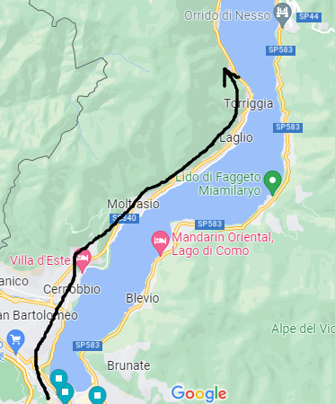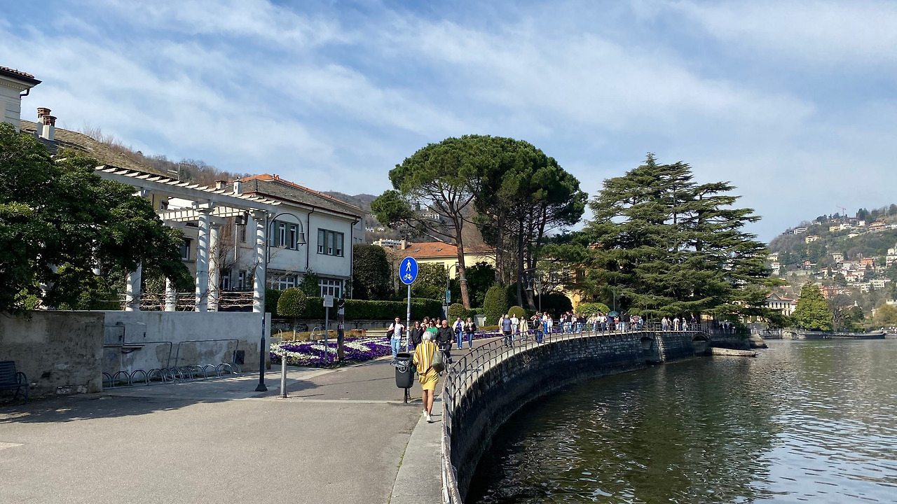 오른쪽으로 호수를 끼고 인도와 차로, 산책로를 번갈아가며 페달을 밟으며 달렸다. 달리는 내내 보이던 오른쪽의 넓디넓은 호수의 전경과 왼쪽의 멋지고 예쁜 건물들, 그리고 이어지는 산등성이들이 환상적인 조화를 이루고 있었다. 그리고, 오래전부터 권력층, 귀족, 부유층들의 주거지나 별장이 많기로 유명한 지역답게 매우 호화스러운 빌라들 또한 곳곳에서 만날 수 있었다.(꼬모 호수 주변의 호화빌라들 또한 이 곳의 유명 관광지로 꼽힌다.)