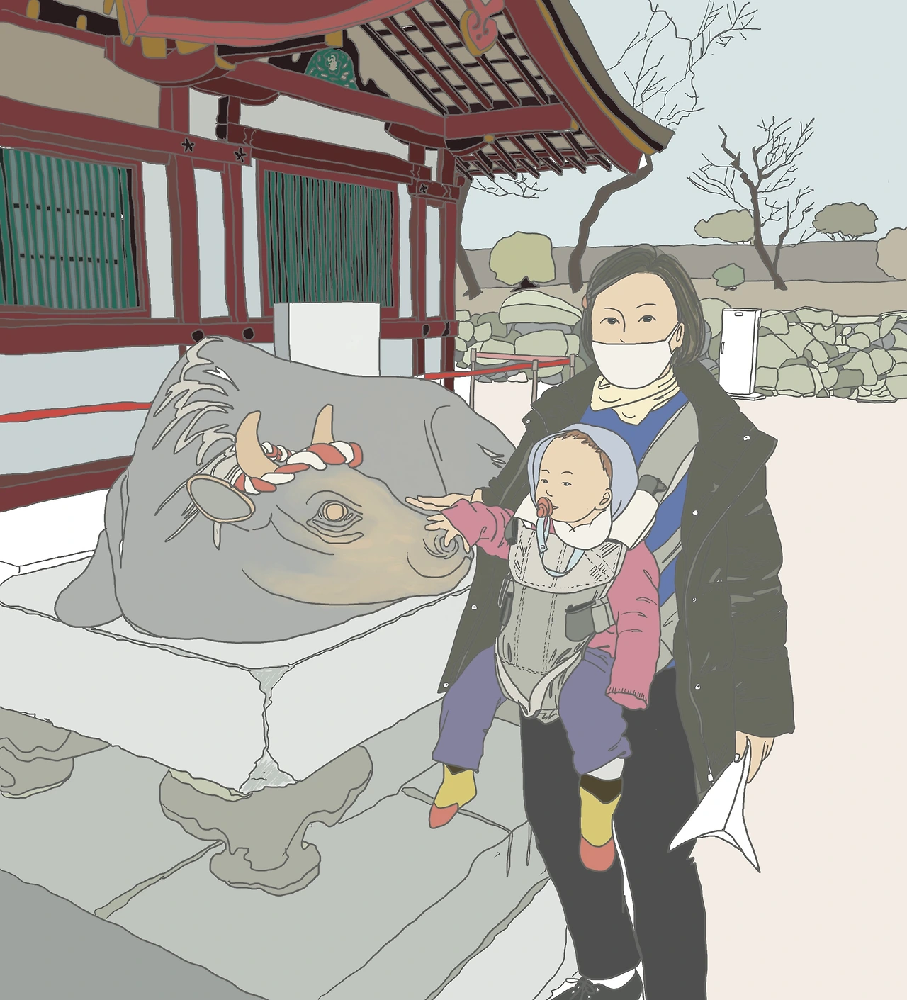 학문의 신을 모시는 곳이라 일본 전역에서도 시험기간이 되면 사람들이 몰려든다고 한다. 소의 머리를 만지면 시험에 합격한다는 이야기에 20년 뒤 시험을 치게 될? 아기에게 소 동상을 만져보라고 했다. 얼음장처럼 차가운 소를..