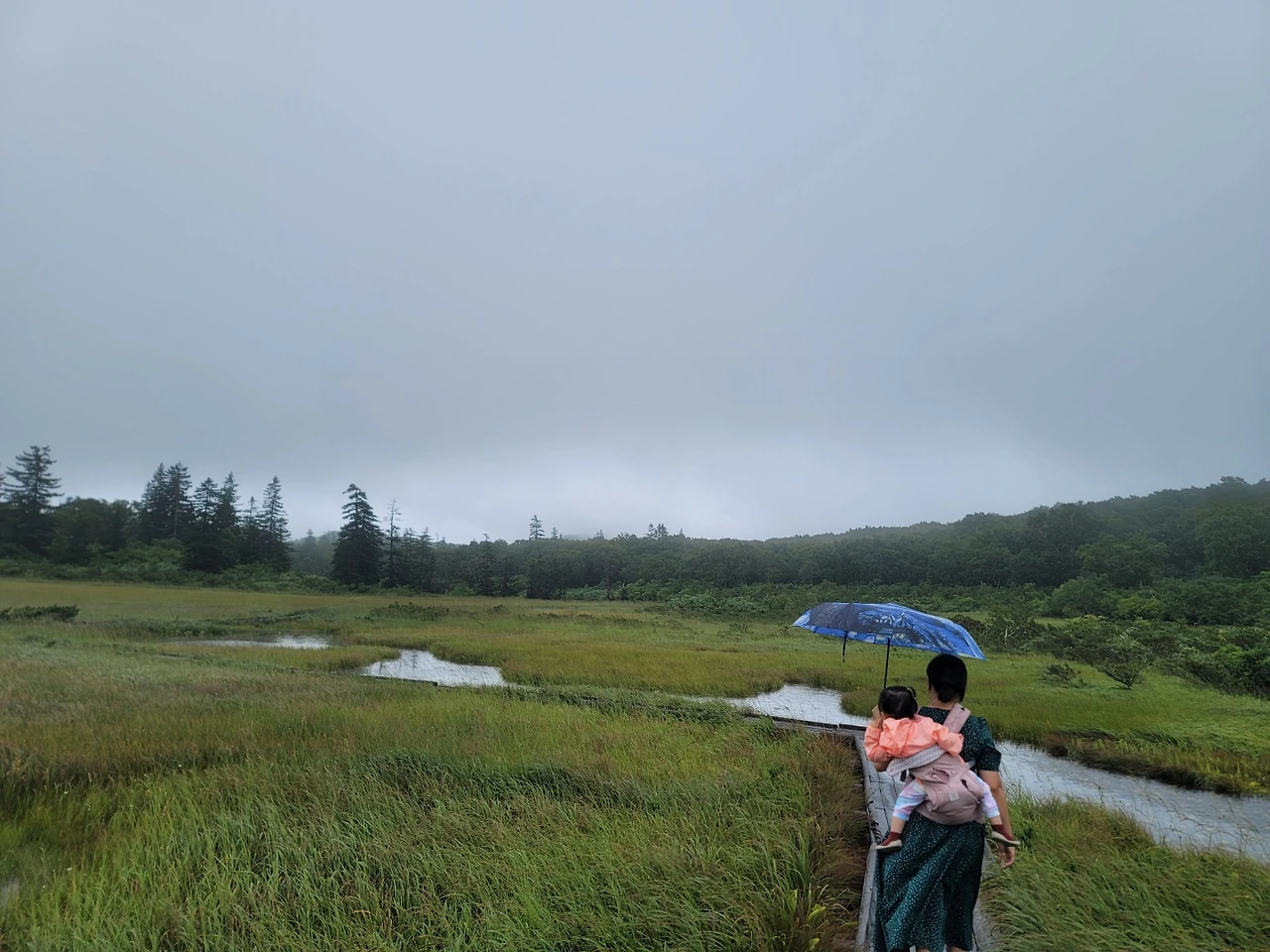 그렇게 기다리고 있으니 비가 살짝 잦아드는 것 같았다. 얼른 다녀오자 싶어 아이를 들쳐메고 늪지로 향했다. 나무 판자길이 이어져 있긴 하지만 바닥이 고르지 않고 패이거나 부서진 곳이 많아 유모차가 다닐 길은 못 된다. 남편에겐 말하지 않았지믄 가끔 곰이 나타난다는 후기도 있어 약간 긴장감을 가지고 빠른 걸음으로 걸어갔다. 아기는 업힌채로 나뭇잎에 떨어지는 빗물을 손으로 받아먹고 있길래 깨끗한 물인지는 어찌 알았나 싶었다. 20여분을 걸어가니 큰 늪지가 나왔다. 날씨가 좋았다면 정말 장관일 것 같았다. 날씨가 다시 흐려지기에 아쉬움을 뒤로 하고 발걸음을 옮겼다. 신선님 늪지 구경 잠깐만 하고 갈께요~라는 가사를 붙여 노래를 부르며 갔는데 정말 한 40분 가량만 비가 그쳤고 주차장으로 되돌아 올 무렵부터는 또 다시 앞이 안 보이게 비가 내리기 시작했다.