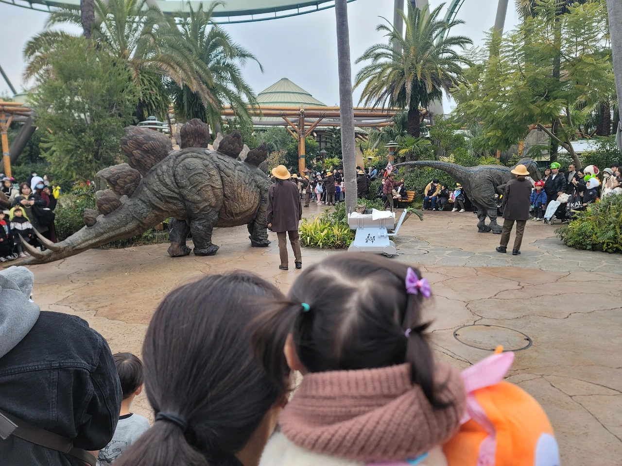 생각보다 피자는 맛이 있었고 토마토스프도 서늘한 날씨를 달래기 좋았고 의외로 맥주는 맛이 없었다. 그래도 온 김에 퍼레이드는 보고 가자 싶어 1시 반까지 여기저기를 돌아다니며 아기가 볼 수 있는 공연을 보았다. 마침 쥬라기 퍼레이드도 재개되었다.