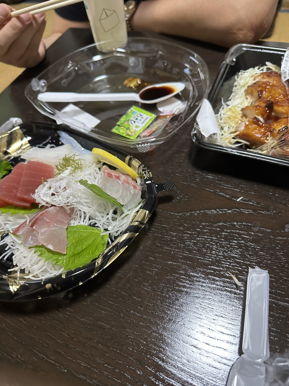 일단 슈퍼에서 장이나 좀 보러 갈 겸 다시 밖으로 나간다. 비가 잦아드나 싶더니 여전히 많이 온다. 슈퍼에서 술과 아기 간식, 그리고 몇가지 술안주를 사서 숙소로 돌아왔다. 짐을 풀고 술안주로 사온 회를 먹어보았는데 가격도 저렴하고 신선도가 극강이었다. 일본에서는 마트에서 파는 해산물도 맛있고 신선하다더니 정말이었다. 이럴 줄 알았으면 석식 신청을 하지 않아도 될 뻔 했다.