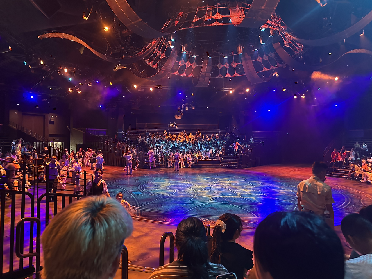 10시가 되자 슬슬 사람들이 몰려온다. 날은 벌써부터 찜통이라 실내 공연 관람과 실외 놀이기구 탑승을 번갈아가며 했다. 아이가 타지 않겠다는 놀이기구가 너무 많아서 동선은 이미 꼬일대로 꼬였고, 날이 덥고 마음이 급하니 그렇게 넓은 부지는 아니었음에도 이곳저곳을 원활히 찾기도 어려웠다. 불꽃놀이가 하이라이트인데.. 그 하이라이트는 밤 9시에나 열린다는데.. 이곳에서 12시간을 버틸 수 있는 것일까? 이미 12시 이전에 우리는 녹초가 되기 시작했다. 실외 퍼레이드는 도저히 볼 자신이 없어서 실내를 돌다가 이곳에서 꼭 봐야 한다는 라이온킹 공연을 보러갔다.