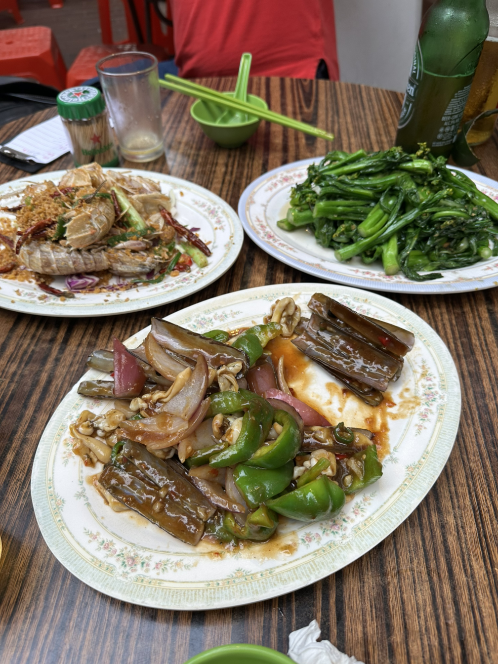 입구랑 연결된 지하철로 달려가서 개찰구를 지나자 아이는 잠에 빠져들었다. 호텔 근처 역에 도착하니 다행히 이곳은 비가 오지 않아서 호텔로 들어가기 아쉬운 마음이었는데 마침 근처 노점이 장사를 시작하고 있었다. 초이삼 유채나물요리, 맛조개 볶음, 새우볶음(가재같이 생긴... 이름을 까먹었다)을 시켰는데 오모나, 이곳이 천국이구나. 아기는 잠에 빠져 깨지를 않기에 남편과 느긋하게 음식을 즐겼다.