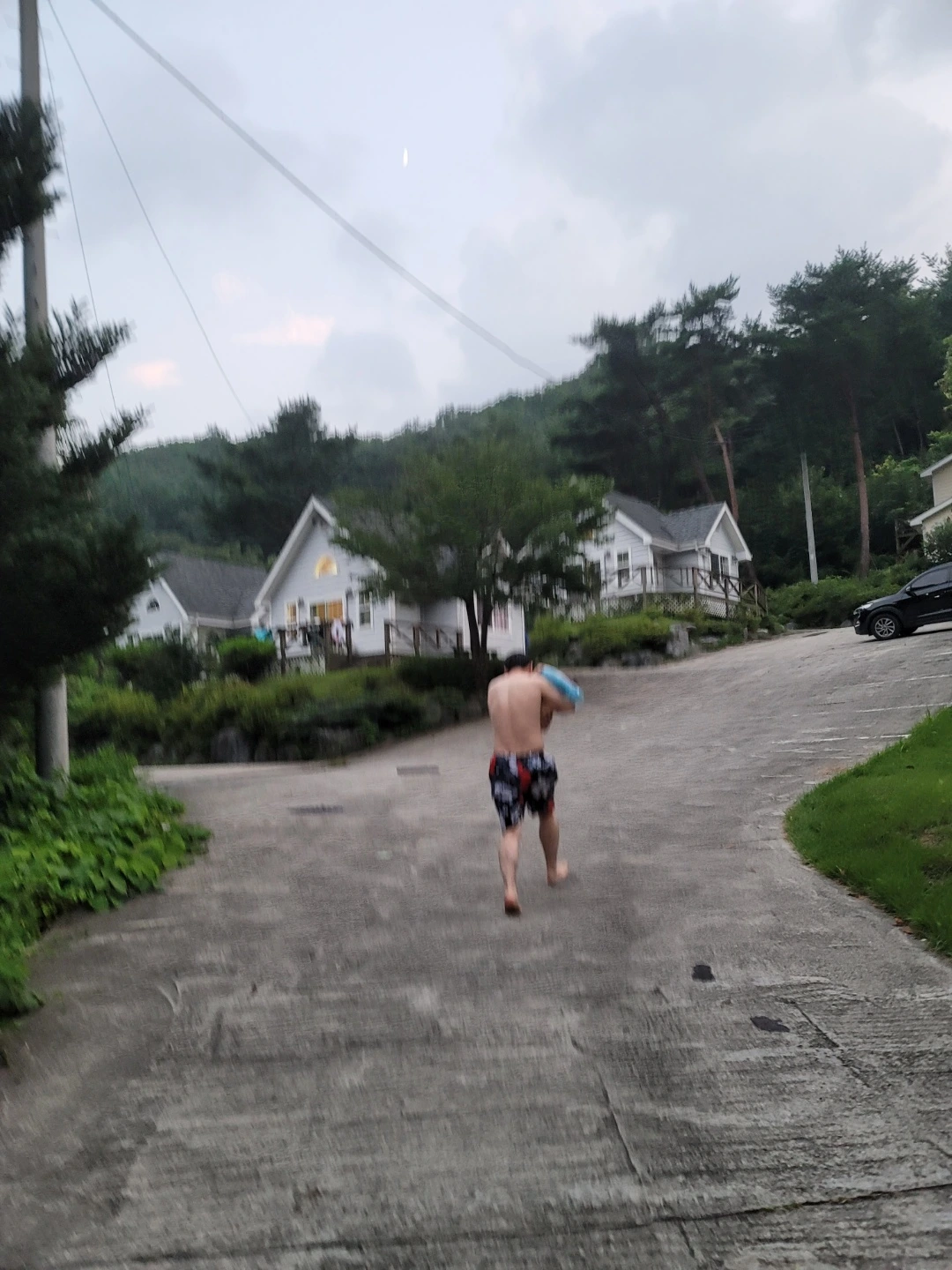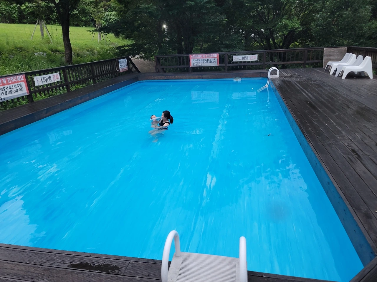 아무리 봐도 이 숙소가 20만원짜리라는 것이 이해가 안되어서 본전 뽑고 싶은 마음에 해가 뉘엇뉘엇해서 영업시간이 이미 지난 텅빈 수영장을 세 가족이 전세내서 휘리릭 수영을 하고 나왔다. 무슨 날파리가 눈에 코에 입에 사방팔방 다 들어가는지 도대체 뭘 할 수가 없고 무엇보다 돌도 안지난 아이가 이 하루 무슨 고생인가 싶어서 5분도 안되어 물놀이를 급히 마쳤더랬다.