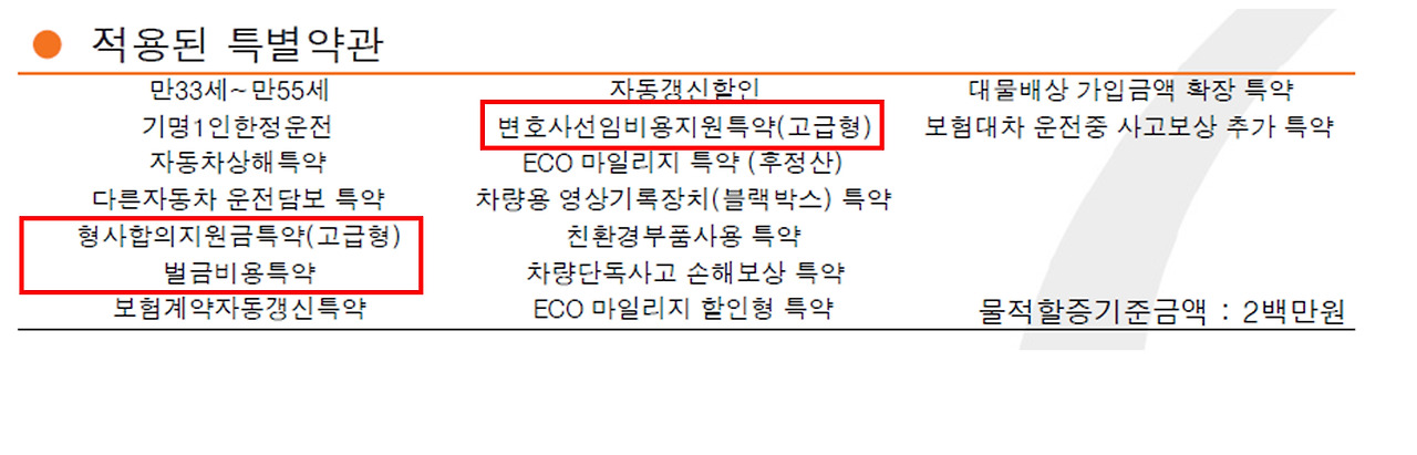 기존 자동차보험에서 1년 만원정도 비용만 보태면 형사책임관련 특약(벌금, 변호사선임비용, 교통사고처리 지원금 보장)에 추가 가입할 수 있었던 것이다. 허탈했던 것은, 그렇게 갱신 재계약에 목 매던 전담 상담원이 이에 관해 몇년간 한마디 귀띔도 해 주지 않았다는 점이다.