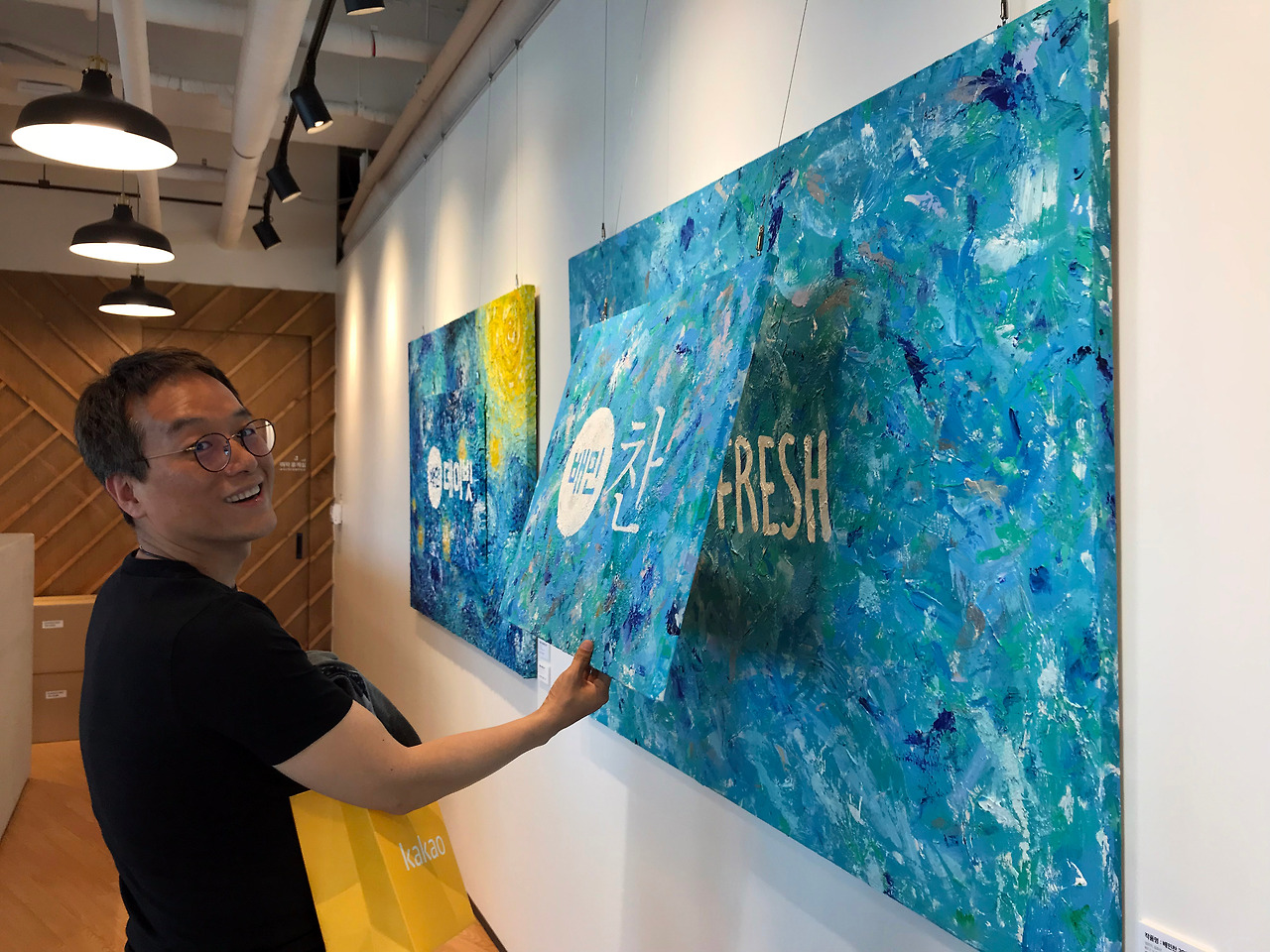 면접 공간이 있는 층에는 이처럼 회사의 주요 3개 사업 영역인 배달의 민족, 배민 찬, 배민 라이더스의 이름을 소재로 한 유화가 걸려 있다. 재미있는 점은, 서비스가 종료되거나 브랜드명이 바뀐 경우 덧댄 그림을 그냥 턱 걸쳐 놓은 부분이다. 예사 기업이었다면 액자를 덜어 내고 새로운 것을 걸었겠지만, 잘 일궈내지 못한 역사도 그것대로 소중히 보관한다는 의미로 다가왔다. 솔직담백한 기업문화의 단면일 것이다.