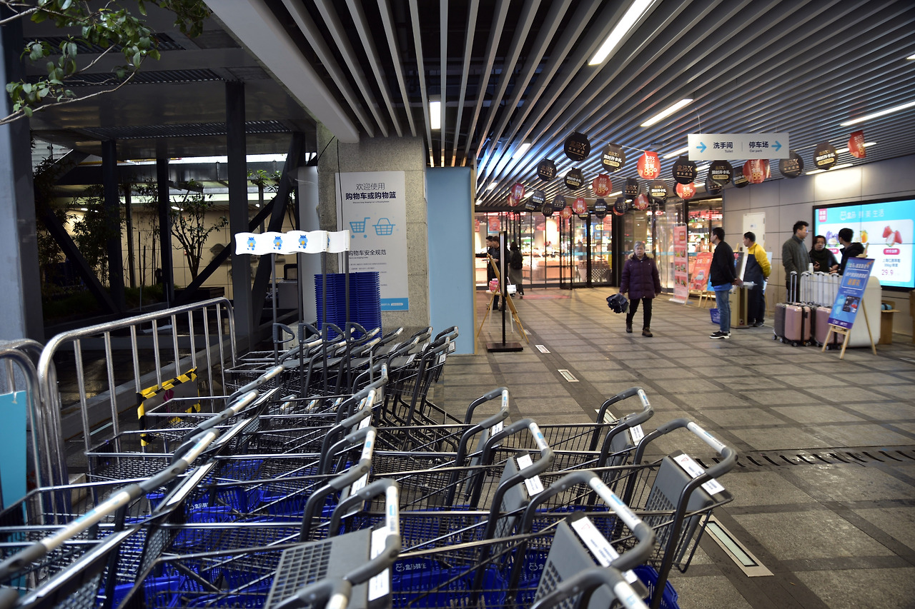 보안 요원들이 촬영을 엄격하게 통제해 아쉬웠던 곳. 알리바바의 마윈이 주도해 유명한 곳. 간혹 무인 판매점 아마존 고와 비교되기도 하지만, 구매와 결제 경험의 혁신을 추구하는 그곳과는 콘셉트가 다르다. 수산물의 구성이 무척 다양하다는 것 외엔 매장의 구성이나 매대 운영 등은 한국의 흔한 대형마트와 별반 다를 바 없었다. 이곳의 혁신성은 천장에 설치된 장바구니 이동 레일로부터 시작된다. 고객이 선택한 제품이 다회용 폴리백에 담겨 천장 레일을 통해 배송요원들에게 전달되어 인근 3km 내 30분 배송이 원칙이란다. 어린이용 카트가 꽤 잘 활용되고 있는 모습이 재밌었다. 매장 내 즉석조리 코너에서 인원 대비 상당한 양의 요리를 펼쳐놓고 먹는 중국인 특유의 모습도 흥미로웠다.