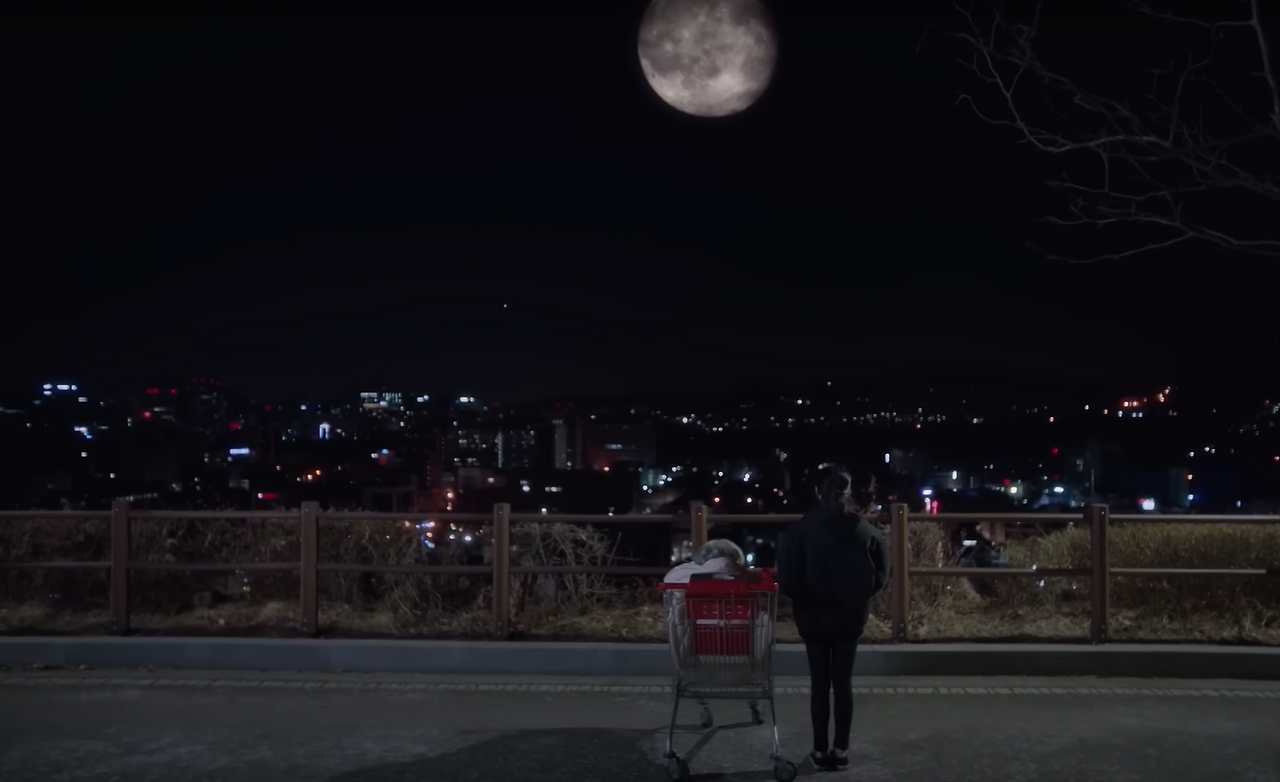 바로 다음 장면에서 지안은 마트에서 기계적으로 필요한 것들을 담는다. 사실 마트 쇼핑은 카트를 훔치기 위한 것. 훔친 카트를 밀며 급히 달리다 학생의 자전거와 부딪힌 지안. 그 장면을 동훈이 목격한다. 카트에서 떨어진 과일을 돌려주기 위해 지안을 따라가는 동훈. 그리고 거기서 카트에 할머니를 싣고 낑낑대는 지안의 뒷모습과 마주하게 된다. 지안은 할머니에게 달을 보여주고 싶었고 그래서 카트가 필요했다. 이불을 뒤집어쓴 채 카트에 실린 할머니. 결국 동훈의 도움으로 밝고 큰 달을 보고 돌아오는 할머니와 지안.