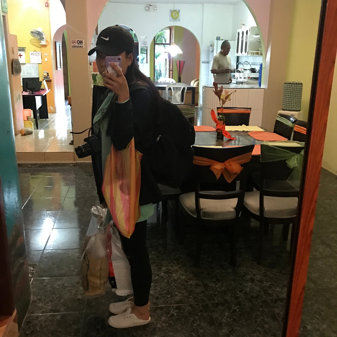 어느새 짐이 바리바리 늘어났다. 오른쪽에 보이는 숙소 아저씨. 너무 이른시간이라 없을 거라더니 어느새 나타나서 커피를 내렸다. 나 배웅하려고 나온 거다.