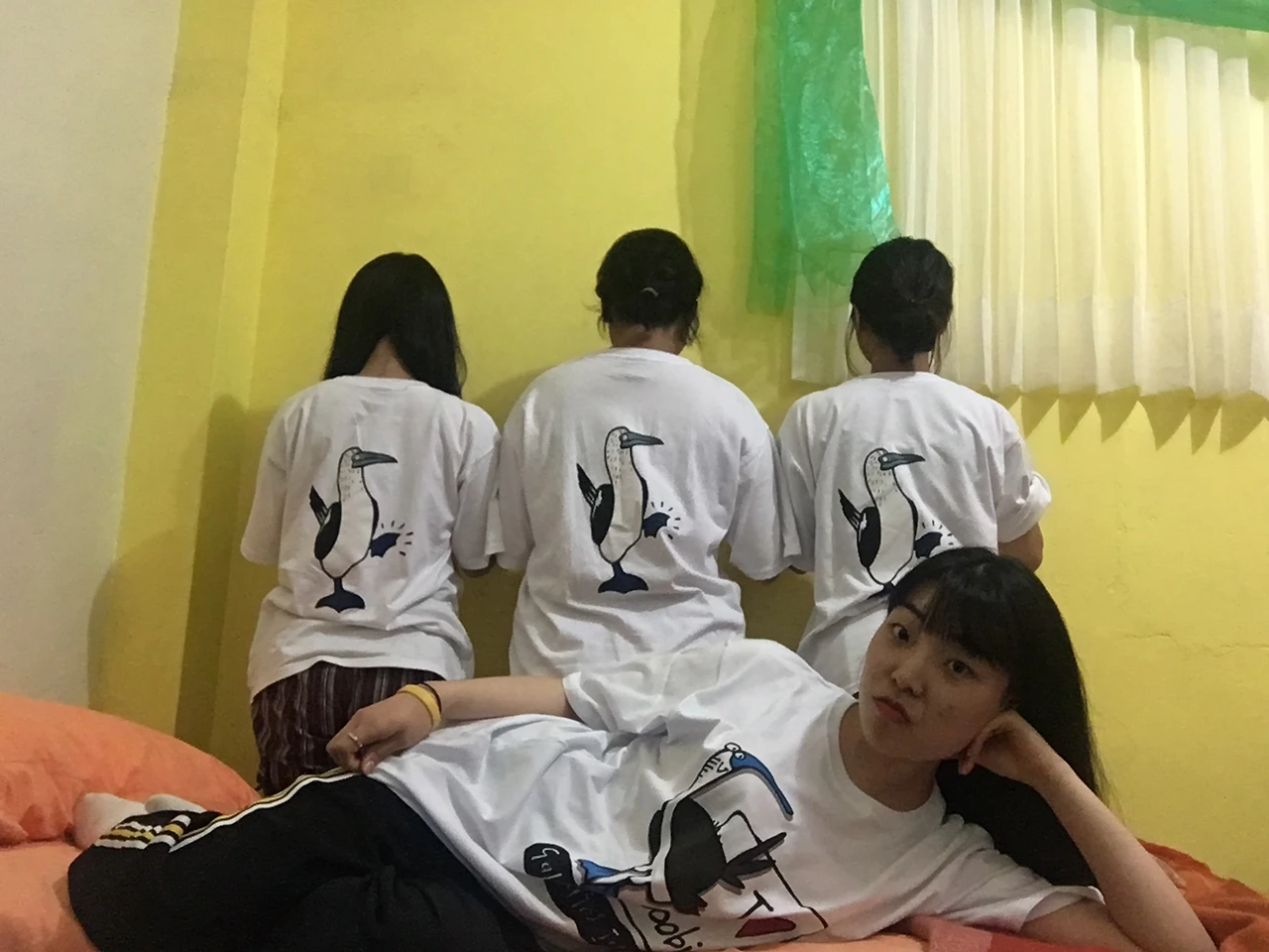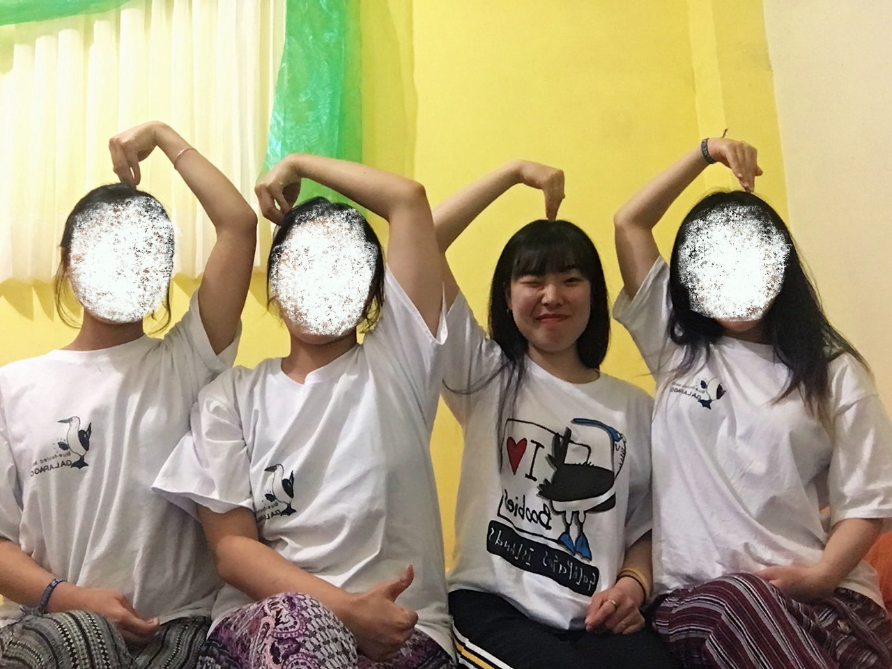 스노클링을 다녀와 저녁을 사서 모이기로 했던 시간에 내 티셔츠가 탐났던 지아언니는 상점가를 돌면서 같은 티셔츠를 샀다. 나는 언니들의 우정티셔츠인 푸른 발 부비새 티셔츠가 부러워서 비슷한 티셔츠를 찾아 샀다. 그날 밤 언니들 방에서 넷이 한참 사진을 찍었다. 우리의 기억이 그 사진에 담겨 있어서 쳐다만 봐도 플레이버튼을 누른 듯 그날의 밤이 상영된다. 에어컨이 고장 났었고, 그래서 언니들 방으로 대피했던 밤. 짐이 없는 날 챙겨준다는 핑계로 옷을 내게 넘기고 짐을 줄여보려던 잔머리와, 덕분에 늦은 밤 온갖 짐이 널브러진 방에서 펼쳐진 간이 바자회, 이 세 명의 조합을 보고만 있어도 너무 즐거워서 짐 싸야 되는 언니들 옆에서 최대한 오래 붙어먹으려고 기를 쓰던 그때가.