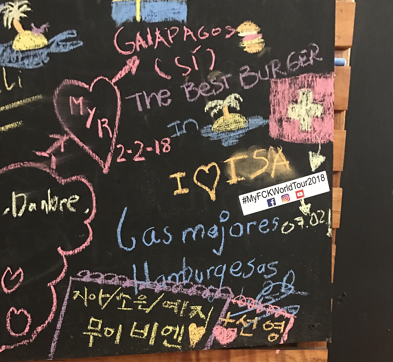 언니들과는 헤어지는 게 정말로 아쉬웠다. 다음 날 갈라파고스를 빠져나가는 언니들의 일정을 쫓아가 내내 따라다니고 싶다는 생각을 할 정도로. 갈라파고스 입도 겨우 이틀 지난 게 아니라 여행이 며칠 진행된 상황이었다면 정말로 따라나섰을지도 모른다. 언니들은 육지로 나갔고, 키커락 투어까지 함께 한 용욱도 숙소를 옮겨 다시 혼자가 되었다. 깔끔하게 샤워를 마치고서 전날 다 함께 저녁 먹을 때 언니들이 사 왔던 크리스버거에 갔다. 나는 해산물을 먹지 못하니까 버거가 가장 만만했다(끝내주는 맛집이기도 했다). 직원에게 부탁해 내 사진을 남기고, 벽에 있는 낙서를 구경하다 언니들의 흔적을 발견해서 그 옆에 내 이름도 추가로 남겨놓고 나왔다. 이렇게라도 끼고 싶은 마음과 아쉬운 마음을 함께 담아서 이름을 꾹꾹 눌러썼다.