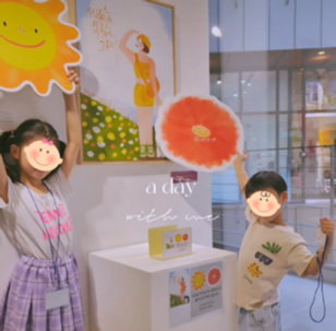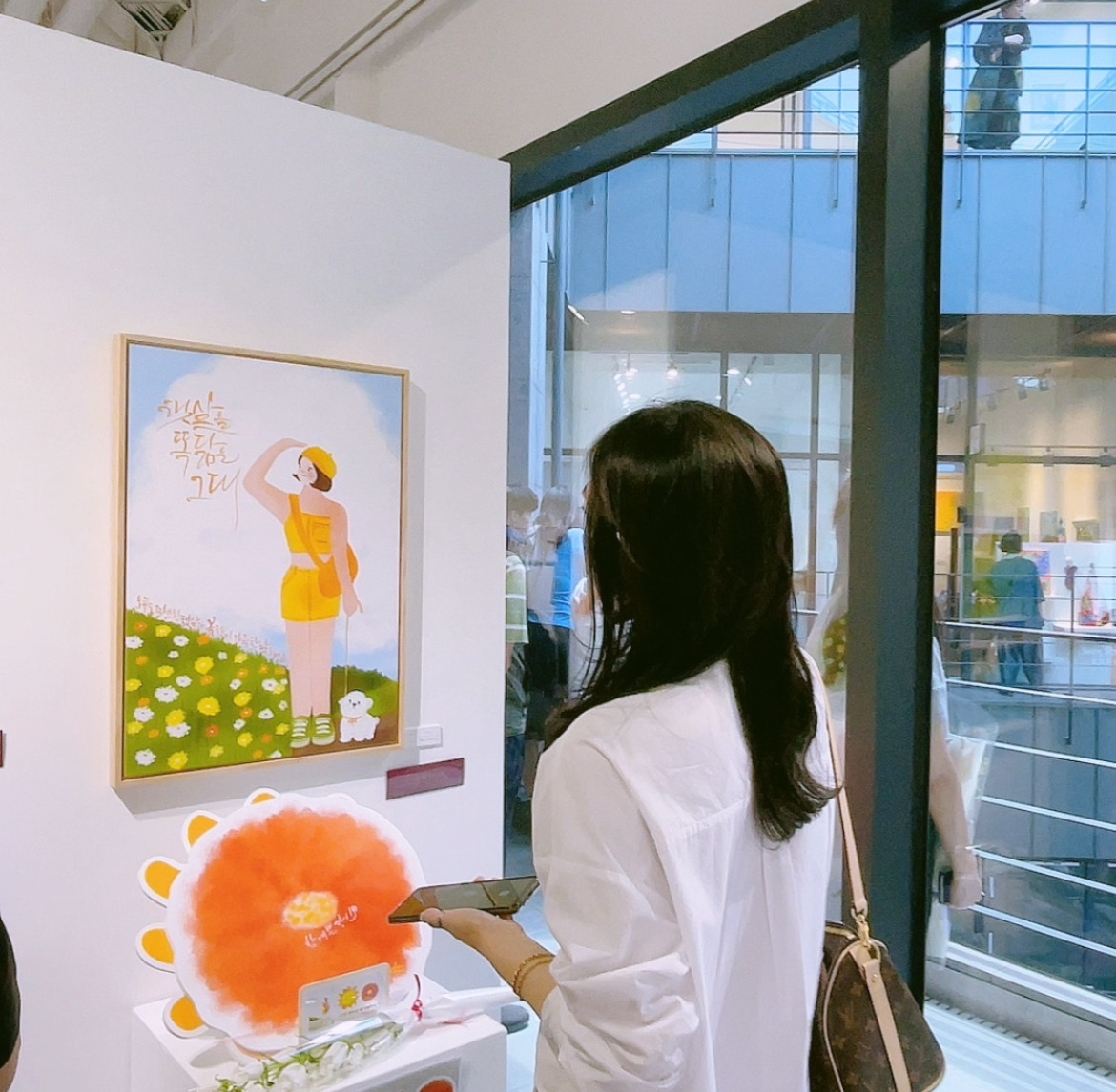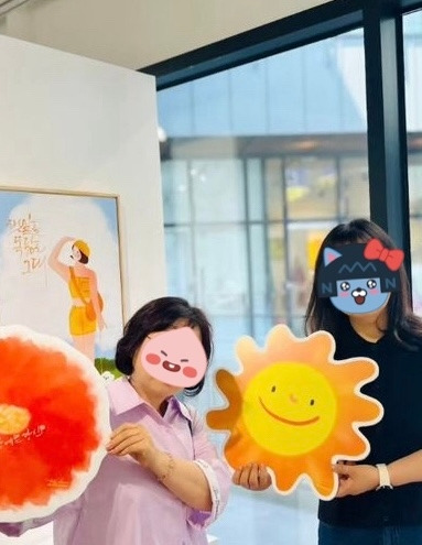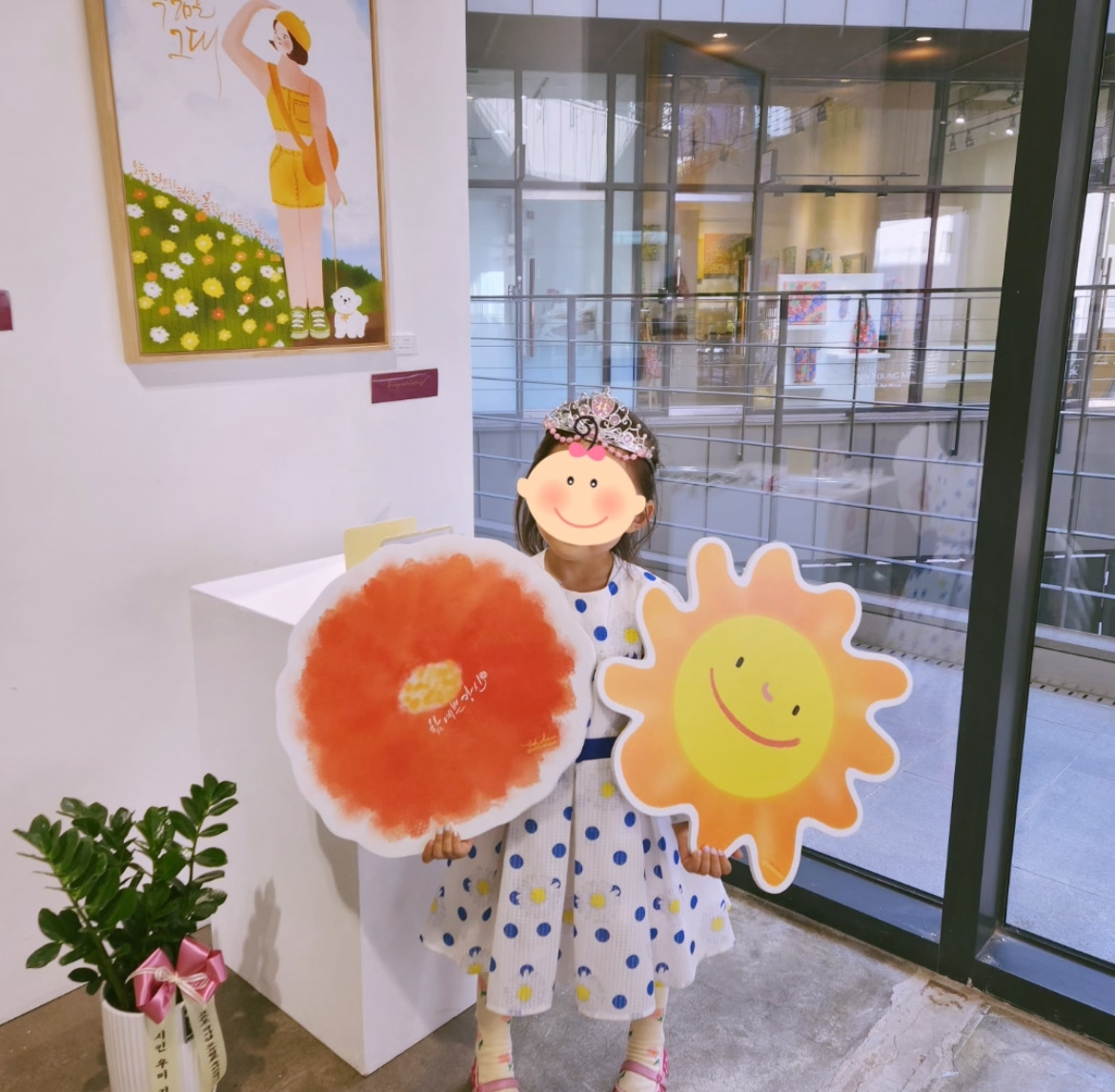 나의 작품 앞에 준비해 둔 ‘해님과 꽃’ 보드판을 들고 사진 찍는 관람객들의 모습들과