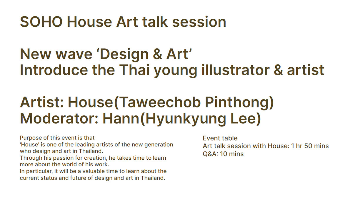 10월 14일 토요일 태국 방콕의 소호 하우스(Soho House)의 아트 토크 세션(Art talk session)에서 태국의 뉴 웨이브(New wave) 디자이너, 아트스트에 대한 이야기를 주고받는 시간을 2시간가량 가졌습니다. 소호 하우스 방콕에서는 태국에서 활동을 하는 디자이너, 아티스트들을 섭외하여 그들의 작업과 삶에 대해 자세한 이야기를 나누는 시간이 월 2회 이상 진행이 되곤 합니다. 이번 Thai new wave 'Thai young illustrator & Artist' 아트 토크 세션에서는 태국에서 활발하게 활동하고 있는 디자이너이자 아티스트인 House(Taweechob Pinthong)의 이야기를 통해 그의 작품 활동에 대해 들어볼 수 있는 시간을 가졌습니다. 이 토크 세션은 제가 직접 모더레이터로 참여하여 이벤트를 진행하였기 때문에 그동안 제가 알고 싶었던 부분에 대해서도 허심탄회하게 물어볼 수 있는 기회였습니다. 그래서 저는 평소에 궁금했던 태국의 영 디자이너, 영 아티스트들이 어떻게 작업을 하고 작품 활동을 이어나가고 있는지에 대해서 자세히 알아볼 수 있어 더욱 뜻깊은 시간이었습니다. 실제 세션에서 진행했던 질문과 답의 형식으로 이번 보고서를 진행하도록 하겠습니다.