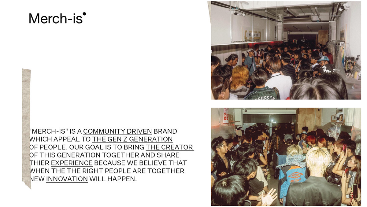 그 예로 'Merch-is' 커뮤니티를 소개하려고 합니다. 이 그룹은 저와 제 친구들이 활동을 하고 있으며 모두 '젠지(Gen-Z)' 세대의 구성원으로 이루어져 있습니다. 일러스트레이터, 패션 디자이너, 회화 분야, 제품 디자이너 등 다양한 전공을 배경으로 하는 영 디자이너, 영 아티스트들이 함께 다양한 프로젝트를 만들어나가는 커뮤니티입니다. 우리는 서로 다양한 영역을 경험하고 새로운 것을 창조함에 따라 앞으로 더욱더 폭넓은 활동을 할 수 있을 것으로 기대됩니다. 얼마 전 우리는 포토매틱(Photomatic)과 컬라보레이션 하여 방콕의 중심지인 쎄얌(Siam)의 리도 커넥트(Lido Connect)에서 큰 이벤트를 진행했습니다. 영 디자이너 그룹에 대한 가능성을 보고 포토매틱에서 지원을 한 행사로 업계의 관심도를 확인할 수 있었던 중요한 이벤트로 기록되었습니다. 앞으로 더욱더 이런 크고 작은 행사들이 진행될 것으로 기대됩니다.