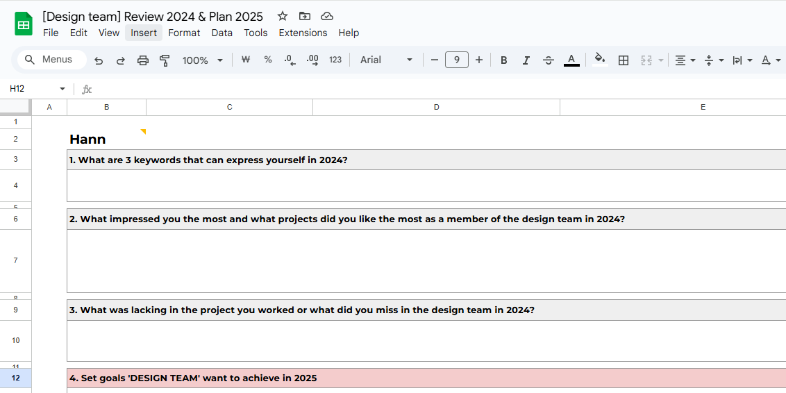 평가도 평가이지만 디자인 유닛 멤버 개인들의 2024년 리뷰와 2025년 목표 설정도 동시에 진행했다. 나에겐 이 부분이 어쩌면 더 중요하다. 2024년 12월 31일에 모든 내용들을 받았고 팀원들 하나같이 모두 그들의 고생과 고민이 평가 시트에 묻어져 있었다. 그리고 이 시트의 내용을 기반으로 곧 1:1 개인 면담 세션을 진행을 해보려고 한다.