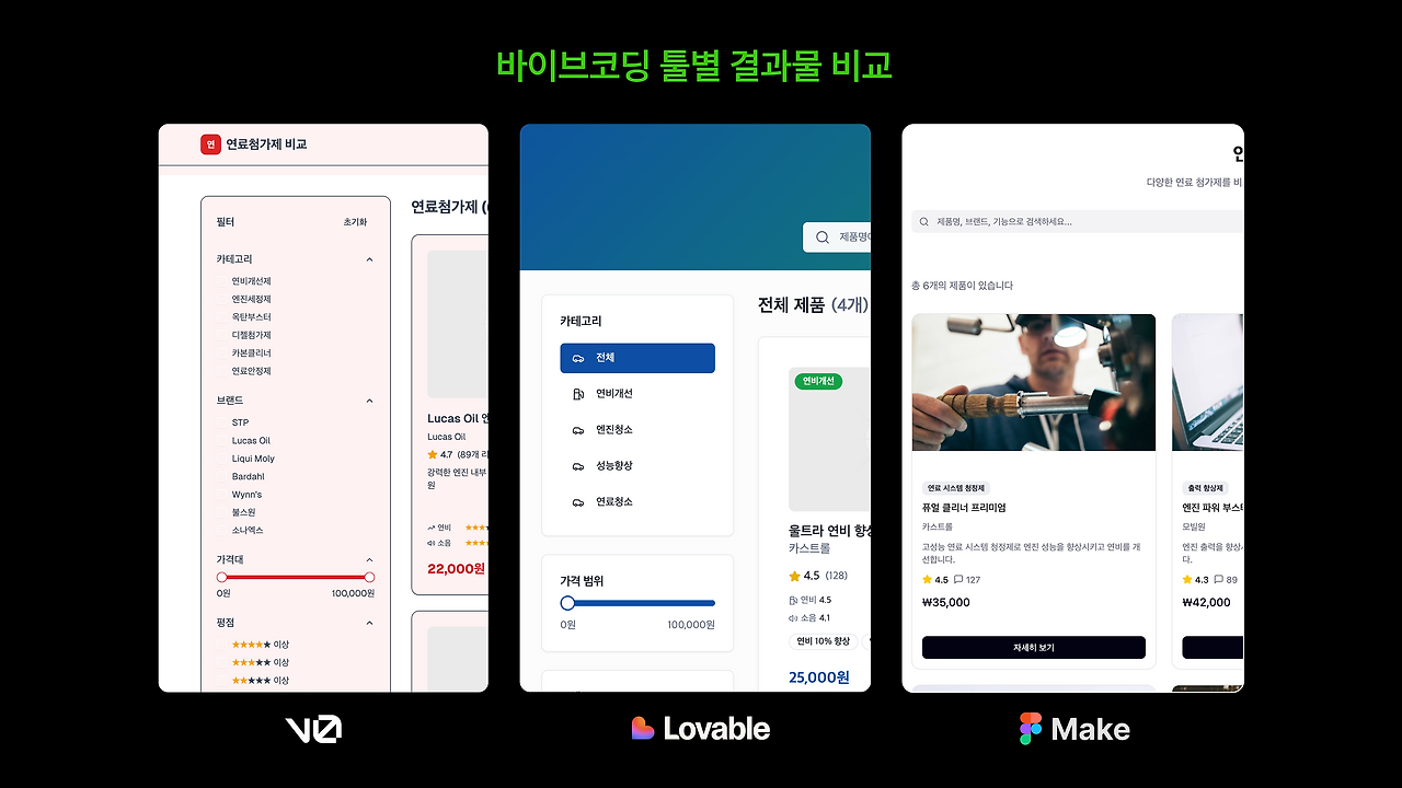 이제 서비스의 화면을 디자인합니다. 우선 바이브 코딩 툴의 실무 활용성을 파악하기 위해 지금까지 정리된 기획 내용만으로 프롬프트를 작성해서 구현해 보았습니다. V0, Lovable, Figma Make 3개의 툴을 비교했으며, 한국어로 프롬프트를 작성하고 GPT로 보완 후 최종 프롬프트를 정리하여 동일하게 툴별로 웹페이지 구현을 요청했습니다.
