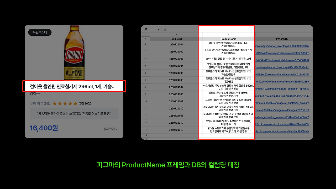 단 수정 시 프레임명이 비슷하면 간혹 오류가 날 수 있으니, 우측 이미지처럼 프레임명을 잘 정리해 줬습니다. 이렇게 정리해 둔 프레임명은 데이터를 하드코딩 할 때도 유용하게 쓰입니다. 1편에서 정리한 데이터들을 알맞은 위치에 매칭시키기 위해 프레임명과 DB의 칼럼명을 똑같이 네이밍 한 후 커서에게 매칭시켜 달라고 요청했습니다.