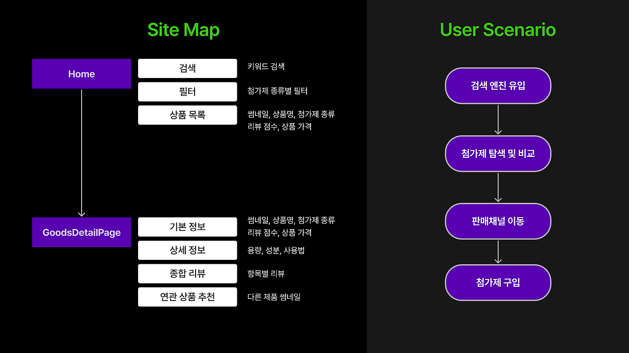 사업개발팀의 요청사항과 저의 기획 방향성에 따라 기능 정의 후 SiteMap과 UserScenario를 간단히 정리했습니다. 구조가 매우 간단하여 IA, UserFlow 등은 생략했습니다.