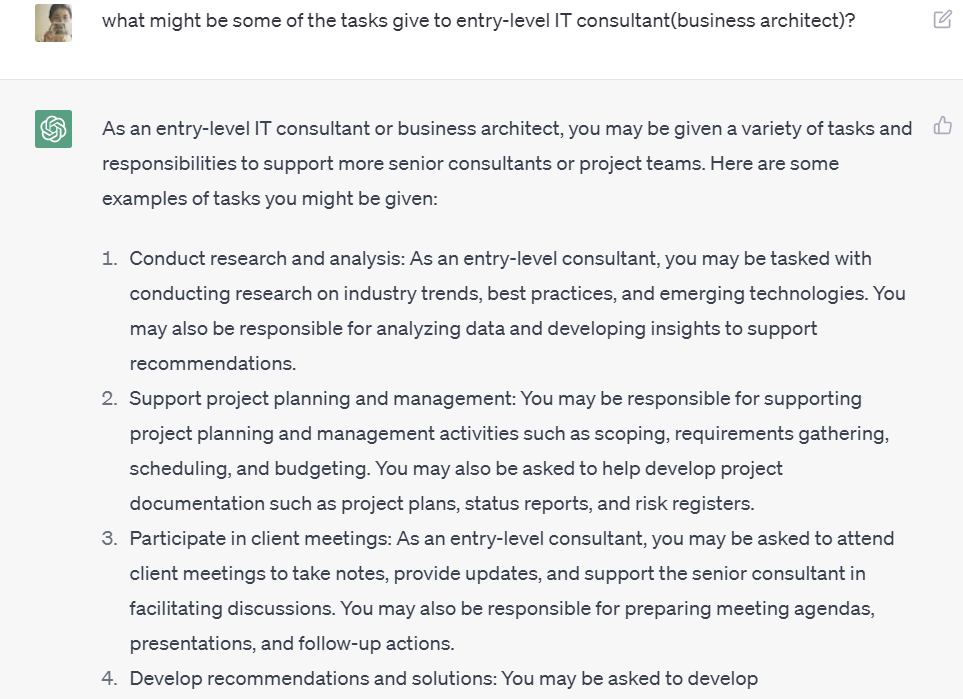 Q: 초급 IT 컨설턴트 혹은 비즈니스 아키텍트가 어떤 업무를 맡게 되는지 알려줘
