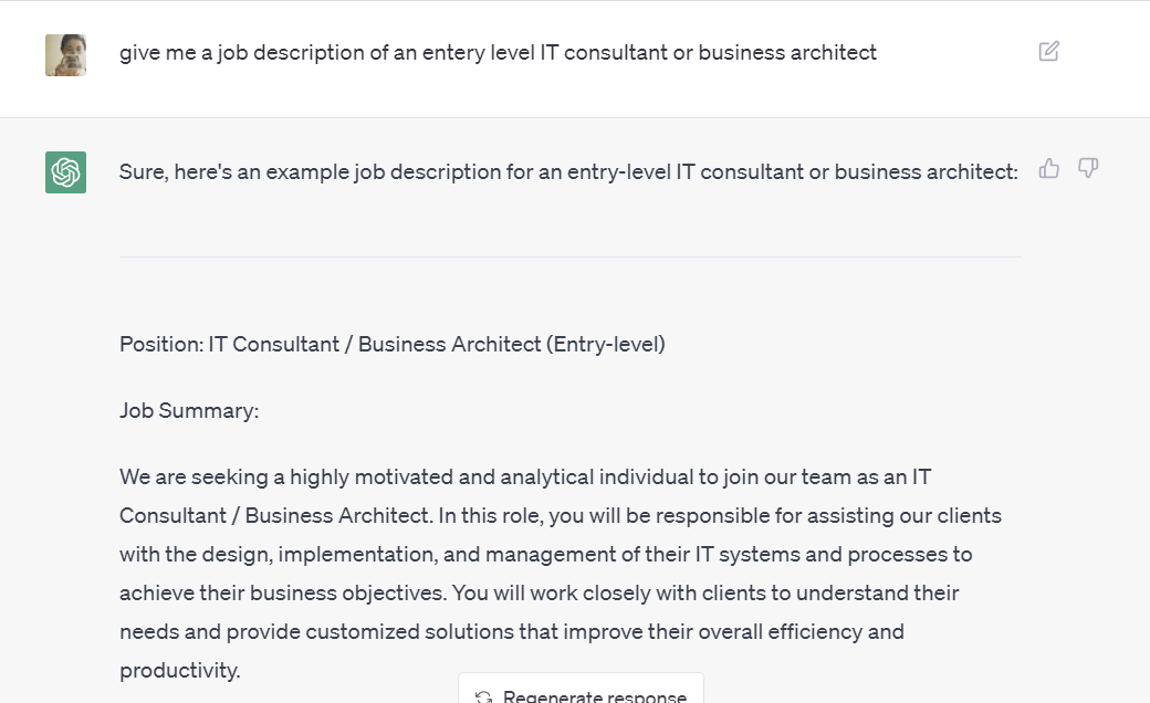 Q: 초급 IT 컨설턴트 혹은 비즈니스 아키텍트의 직무기술서(job description)를 보여줘