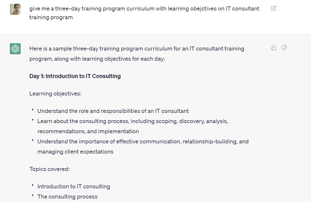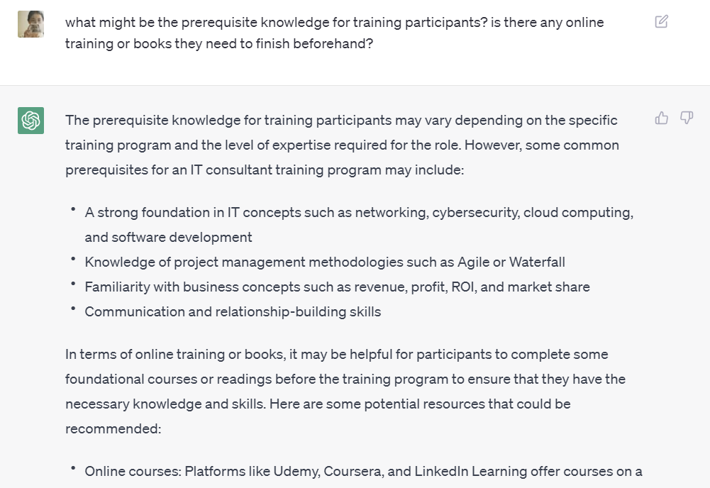 타깃 대상에게 무엇을 가르쳐야 할지 가늠하기 어려울 때, 서점으로 달려가 해당 직무 개론서를 사서 읽어보거나, 구글에 서치 하느라 하루종일 붙어 있는 대신 챗GPT를 활용해 볼 수 있겠다. 아래는 내가 잘 알고 있는 IT컨설턴트라는 직무에 대해서 교육내용의 바운더리 파악을 위한 질문을 던진 예시이다.