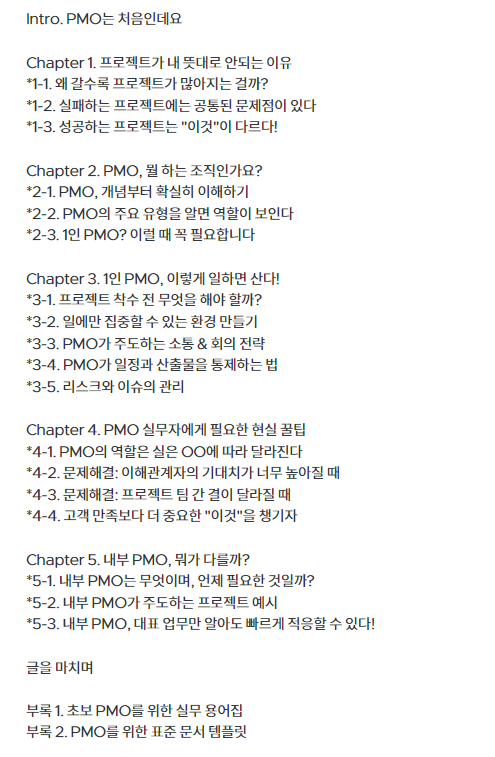 브런치에서는 그냥 프로젝트 하면서 그때 그때 찾아본 내용들, PMO 일을 하면서 느낀 점들을 기록했다면, 전자책에서는 좀 더 기초부터 차근차근 최대한 제가 알게 된 내용을 체계적으로 정리하였습니다.
