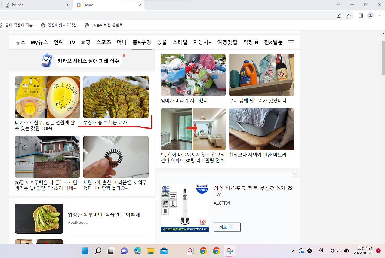 1만이 넘고 2만 3만이 넘어가는 심상치 않은 조회수를 기록하고 있었다. 조회수에 비해 라이킷 수는 많지 않았지만 분명 어딘가에 내 글이 노출되어 있다는 생각이 들어 다음 홈페이지를 보니 역시나 "홈 쿠킹" 페이지에 떠 억 하니 올라와 있었다. 이번에 쓴 글은 음식에 대한 레시피도 없다. 내조의 여왕이라는 자랑질도 아니다. 아무런 반항 없이 남편이 부탁하는 대로 최선을 다해 묵묵히 도와준다는 글이었다.