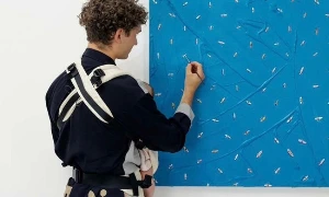 전시에서 가장 오래 시선이 머물렀던 건, 아기를 안고 작업하는 그의 사진이었다. 어릴 적 스티커를 모으던 소년은 이제 아이를 품에 안고 그 시절의 감성을 다시 그려내는 듯 했다. 곱상한 외모의 금발 청년이 아기띠를 맨 채 캔버스 앞에 서 있는 모습은 퍼포먼스 같기도 했고, 그저 자연스러운 일상 같기도 했다.