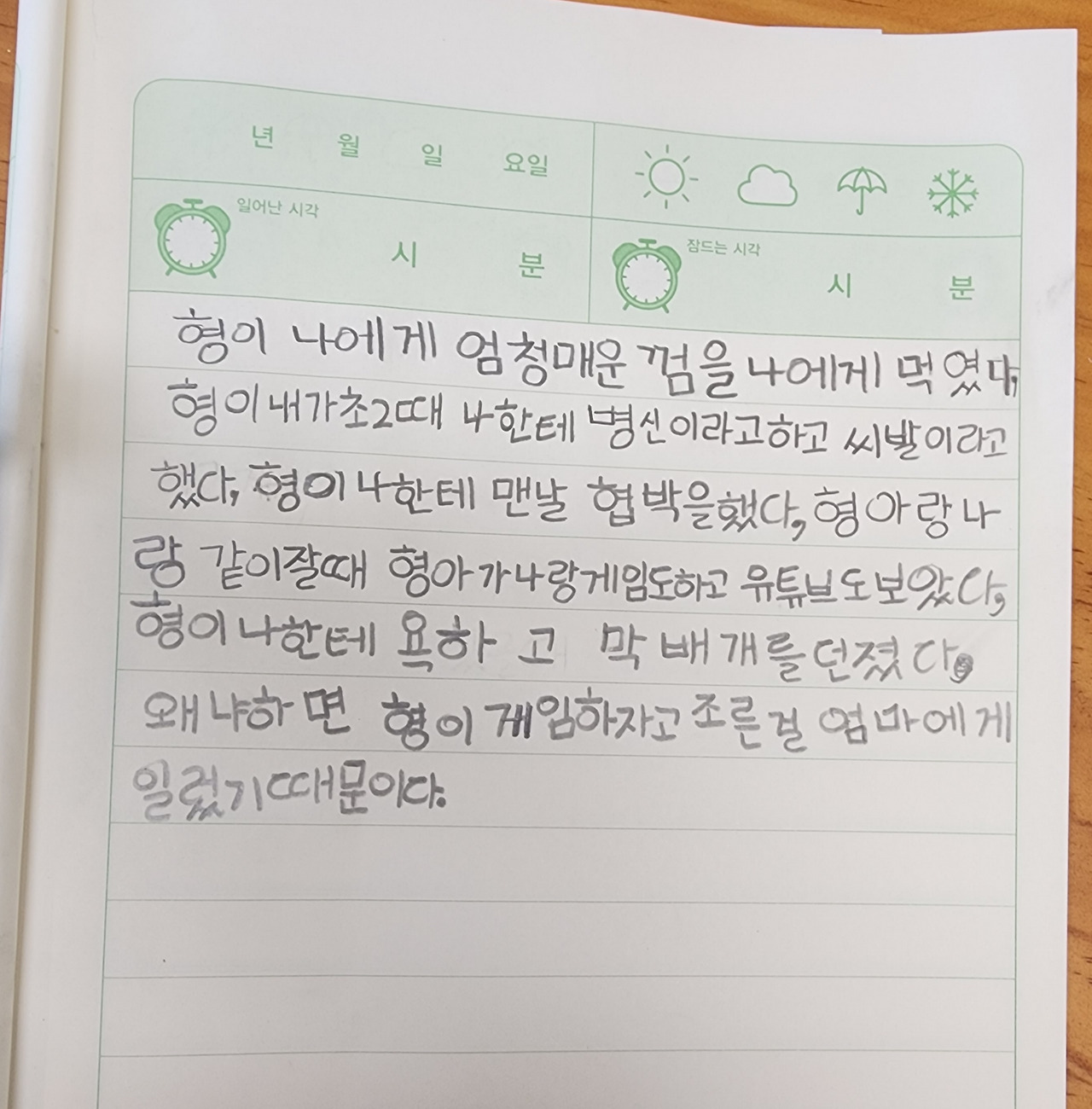 엄마는 형을 경찰에 신고하려면, 먼저 제 진술서가 필요하다고 했습니다.