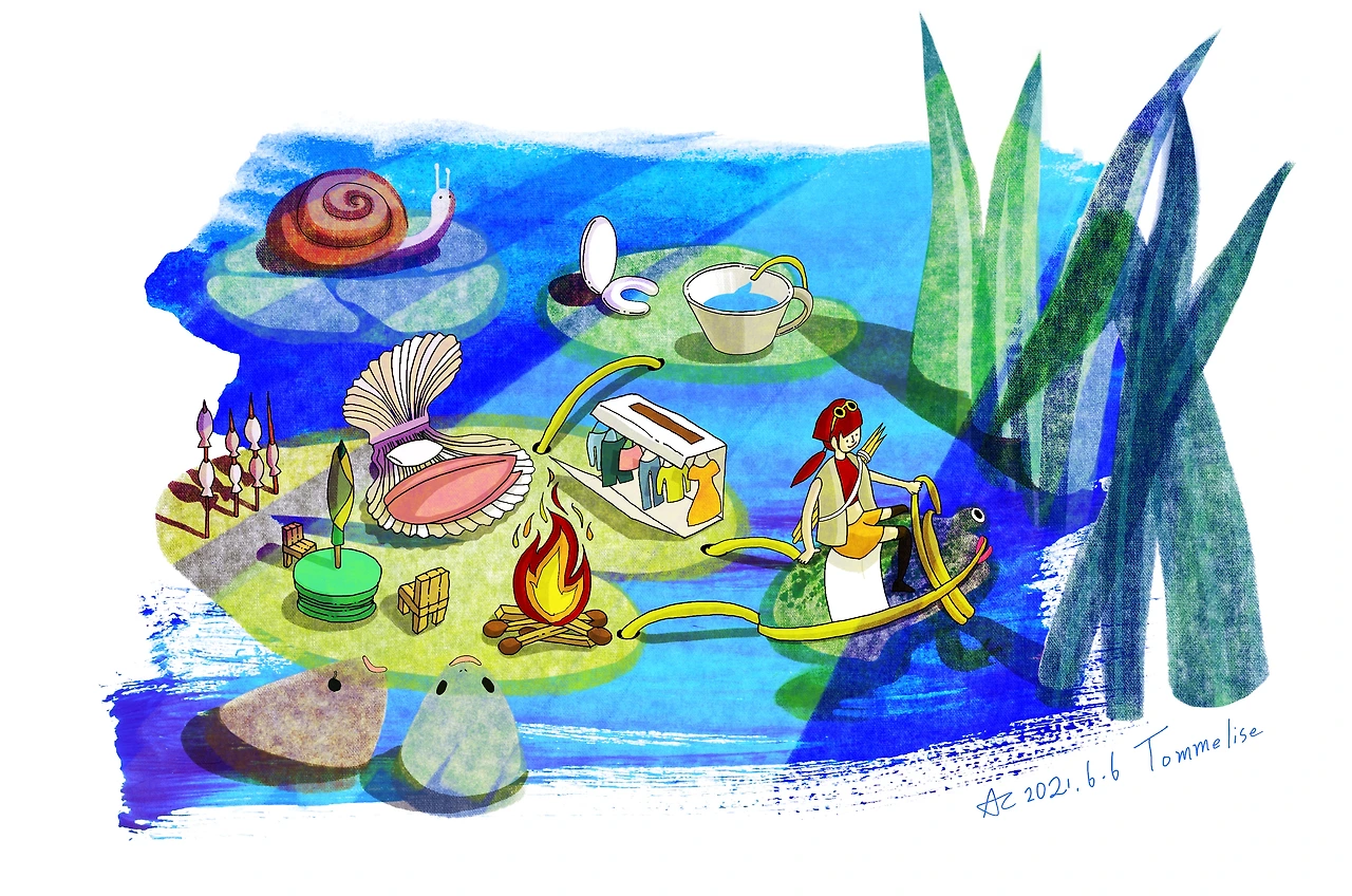 조금 더 구체적인 상상의 표현을 위해 줄거리를 찾아보니 웬걸. 아무리 작다고 해도… 생각보다 너무나 연약하고 수동적인 여성의 모습이었던 거죠. 계속 누군가에게 납치되고 조롱당하고 결혼을 강요받고… 이 모습은 21세기 현재 아이들에게 들려줄만한 이야기는 아니라는 생각에, 제가 소망하는 엄지공주의 능동적인 모습을 그려보았답니다. 여전히 키도 작고, 보잘것없는 것들로 의식주를 꾸리고, 여전히 집이 아닌 연못에 있지만… 좌절하지 않고 자신이 선택하지 않은 위기 상황을 오히려 성장의 기회로 만드는 모습을 그려내고 싶었어요. 그게 지금의 저 자신에게 들려주고 싶은 이야기이자 메세지니까요.