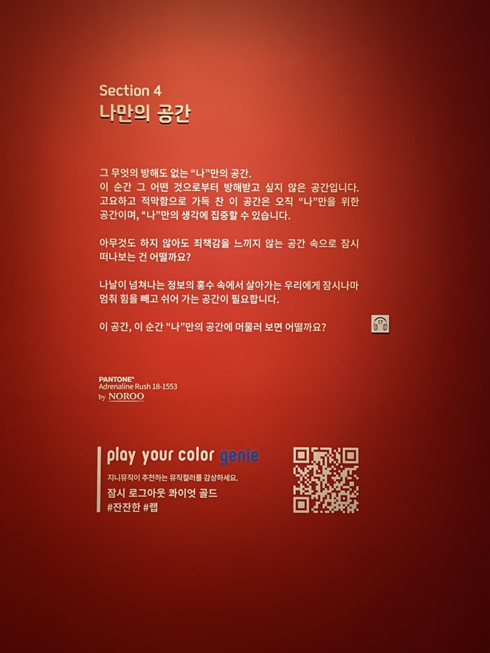 이번 전시의 무드가 더 깊이 느껴진 장치에는 작품 자체만이 아니라 각 섹션의 주제에 맞는 배경 컬러, 그리고 섹션마다의 뮤직 플레이리스트 덕분이었던 것 같다. 지니와 노루페인트의 협찬을 통해 전시 내내 눈과 귀, 그리고 정신이 집중하는 즐거움을 느낀다.