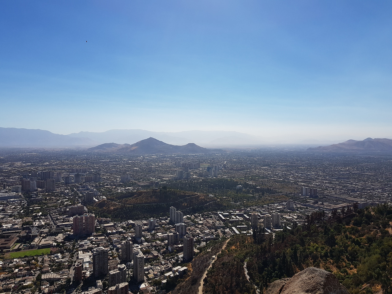 언덕을 올라가니 반대편으로 산티아고 시내 전경이 한눈에 펼쳐진다. 저 먼 곳은 뿌연 안개와 자외선으로 잘 보이지 않았지만, 이 땅이 얼마나 평평하고 넓은 땅인지 한눈에 들어왔다. 높은 건물은 그렇게 많지 않아서, 남산에서 서울 전경, 특히 내가 근무하는 을지로 종로 명동 쪽을 바라볼 때와는 사뭇 다른 감상이 들었다.