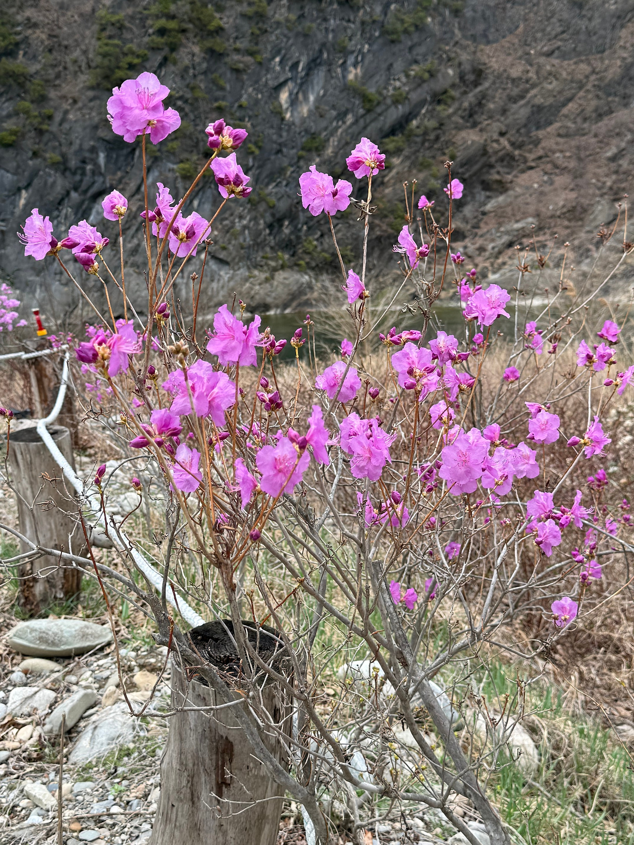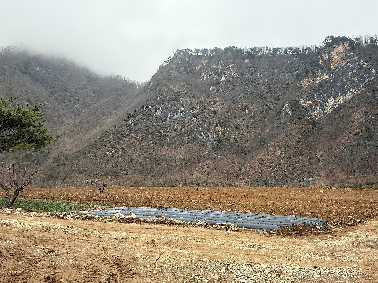 민박길에서 강가로 이어지는 길에는 길고 넓은 밭이 펼쳐져있었다. 이곳 또한 민박집주인의 공간인 듯, 봄을 맞아 새로운 작물들이 뿌리를 내리는 중이었다. 기온은 아직 차지만, 그래도 봄이라는 듯 보라색 꽃이 예쁘게 피어나고 있었다.