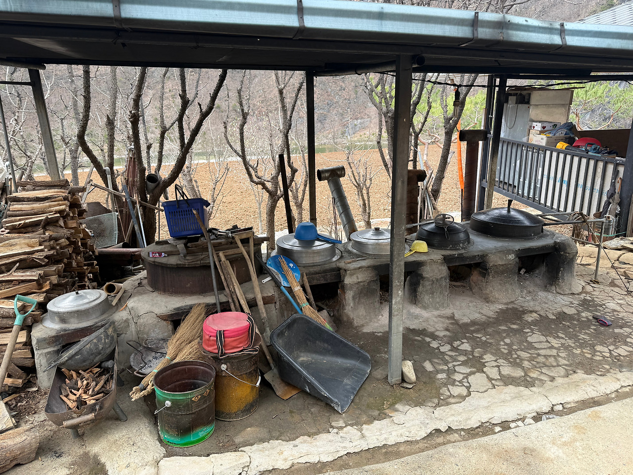 거북이마을이라는 팻말이 나오고도 한참 더 들어가자, 내비게이션이 최종 목적지임을 알렸다. 우리는 시동을 끄고 차에서 내렸다. 제일 먼저 눈에 들어온 것은 가지런히 정돈된 장작더미와 그 옆에 백숙을 끓일 때 쓰이는 듯한 아궁이와 가마솥 몇 개가 보였다. 주위를 두리번거리며 사장님을 애타게 불러봐도 대답이 없자, 나는 민박집 사장님께 전화를 드렸다.
