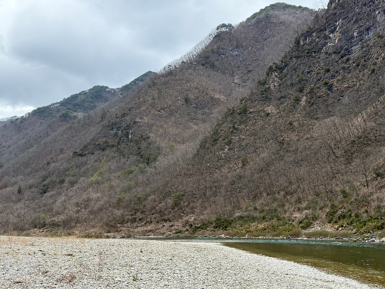 산을 넘고 강자락 쪽으로 이어지는 작은 길들을 따라 조금 더 들어가니, 이 길이 맞나 싶은 순간이 여러 번 찾아왔다. 도로가 끊긴 것 같은 지점도 있었으며, 움푹 파인 길도 있었다. 그래도 일단 내비게이션을 믿고 작은 마을 길들을 지나쳐가니 저 멀리 동강이 보였다.