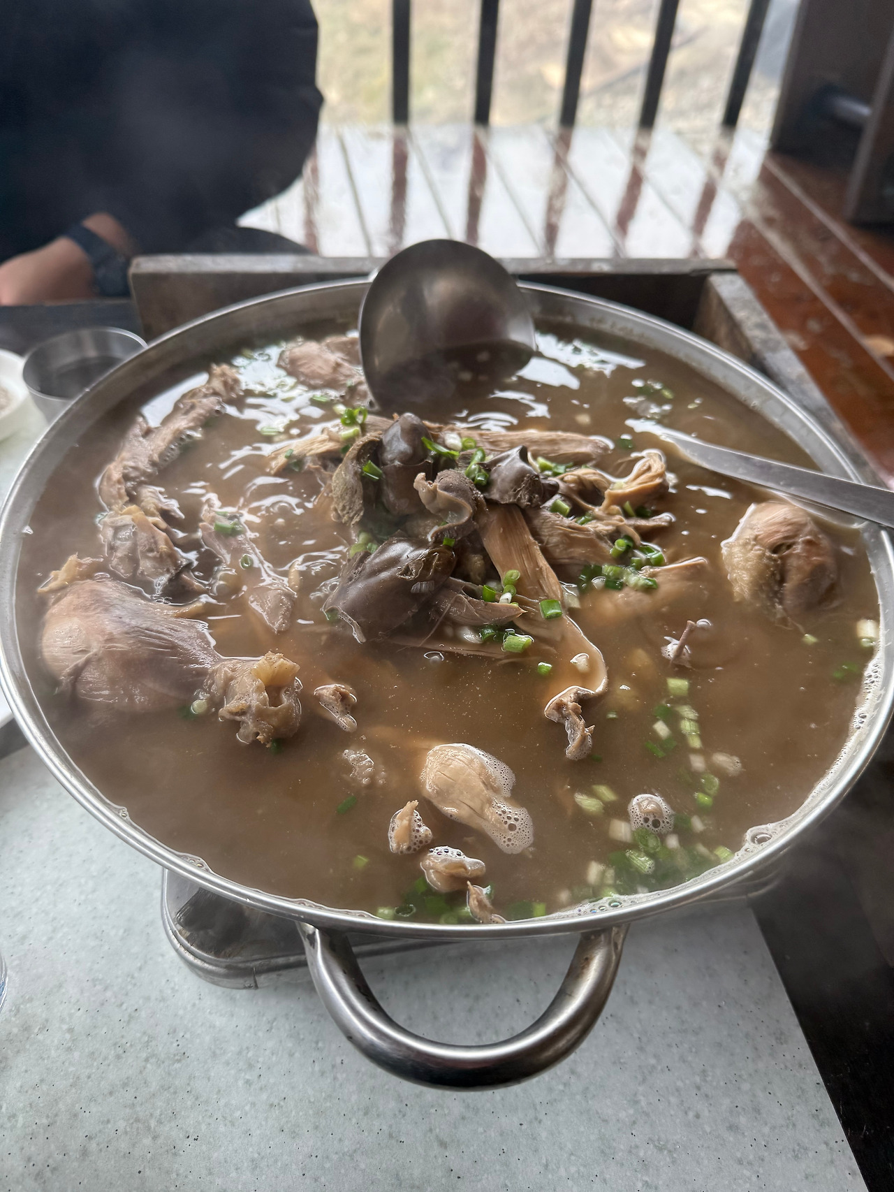 아침에 식사를 하는데 사장님이 물었다. 전날 해가 지고 식사를 하니 추웠다. 우리는 오늘은 5시쯤 해가 지기 전에 식사를 하고 싶다고 의사를 전했다. 그러시자는 대답과 함께 가마솥에 백숙이 끓기 시작했다. 아침부터 끓이기 시작해서 저녁에 우리에게 내주기 전까지 푹 고으는 것 같았다. 긴 시간 동안 가스나 전기가 아닌 장작으로 불이 꺼지지 않게 계속 신경을 쓰는 듯했다. 손님에게 내어줄 음식을 하는데 들이는 시간과 정성을 생각하면 ‘한 마리, 3~4인분, 8만 원’은 오히려 싼 것 아닌가 하는 생각이 들 정도였다.