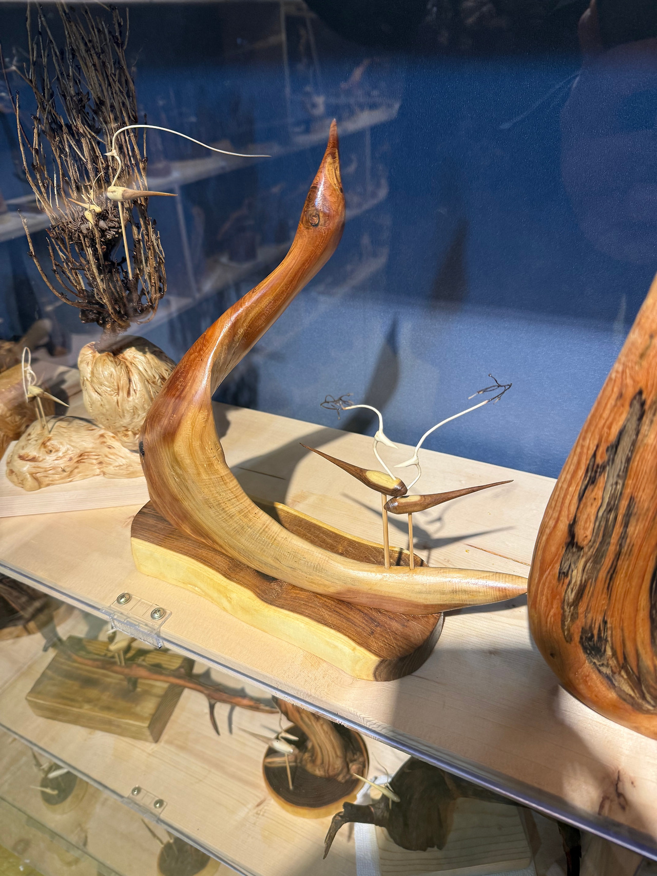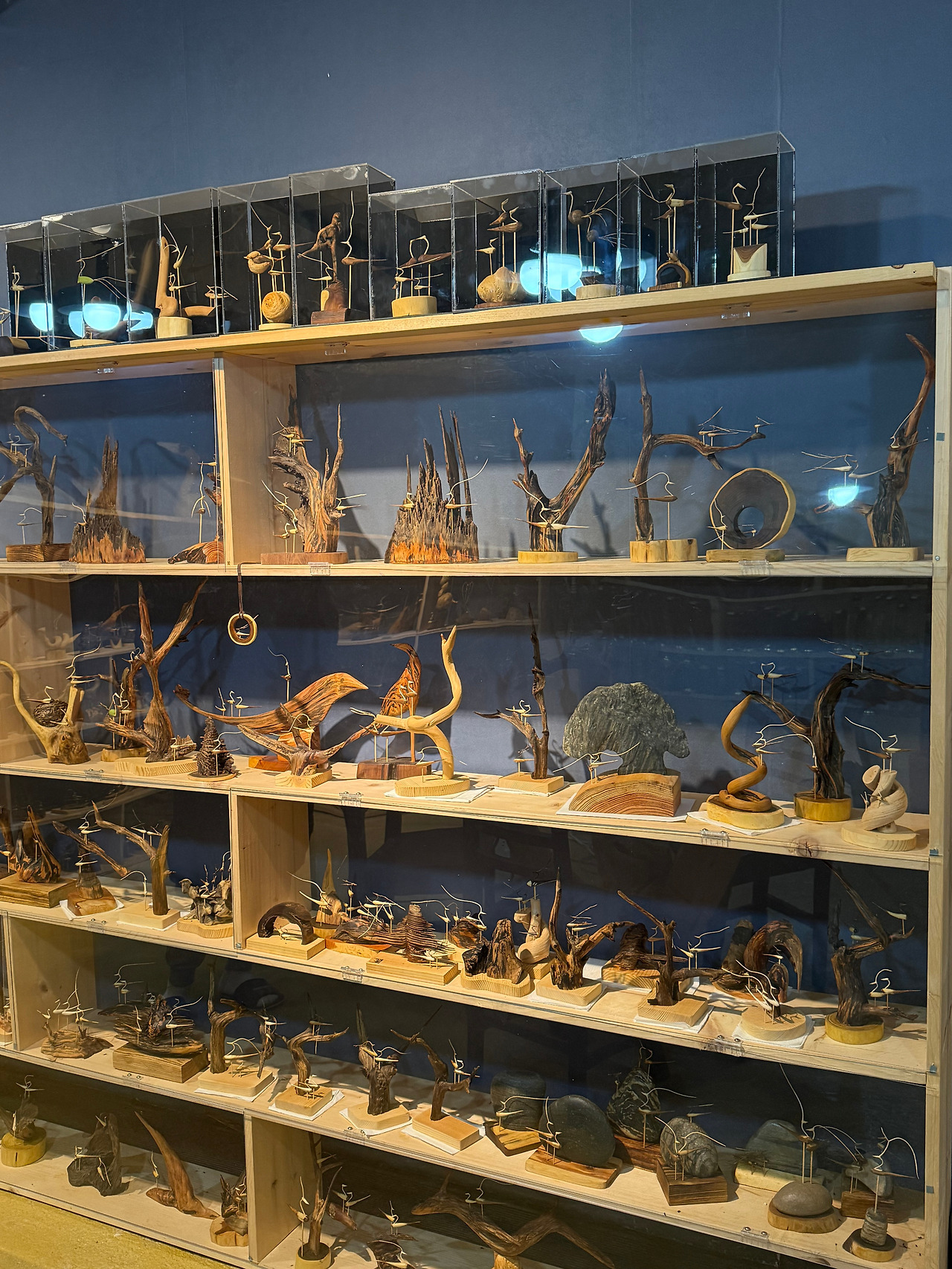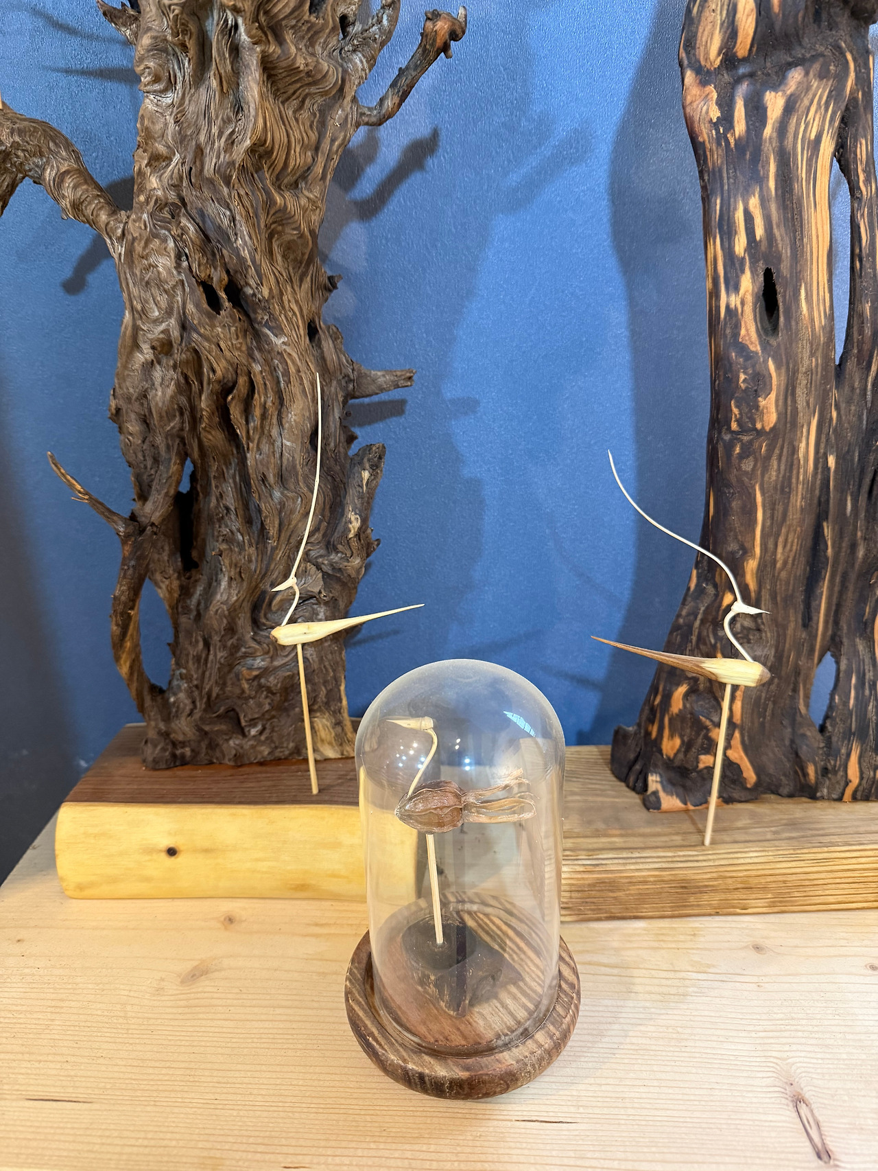 “맞아요. 저렇게 솟대를 만드는 건 저밖에 없어요. 저게 제 작품의 포인트거든요. 뿔을 나타낼 수 있는 얇은 나뭇가지를 찾아서 그대로 쪄서 말리고, 나머지 나무 부분은 깎아서 새를 만드는 거예요.”